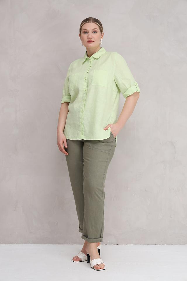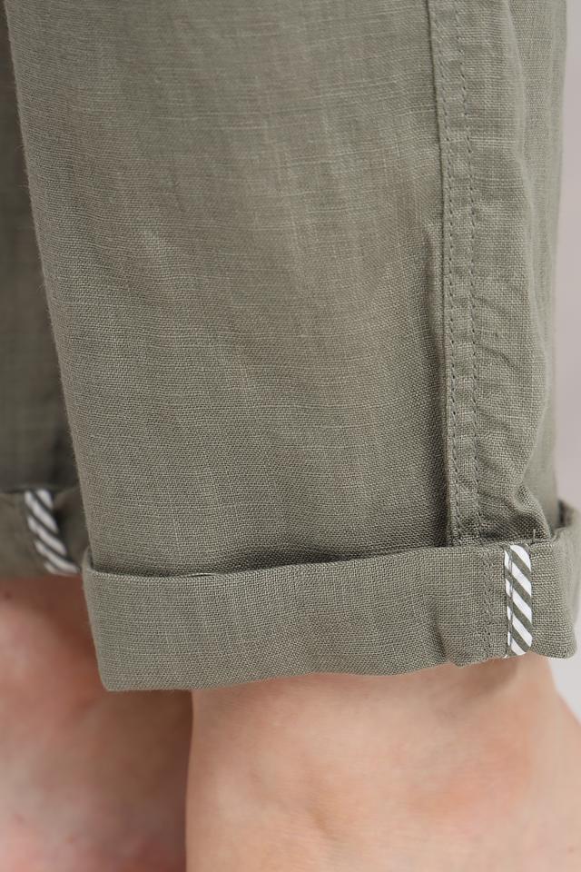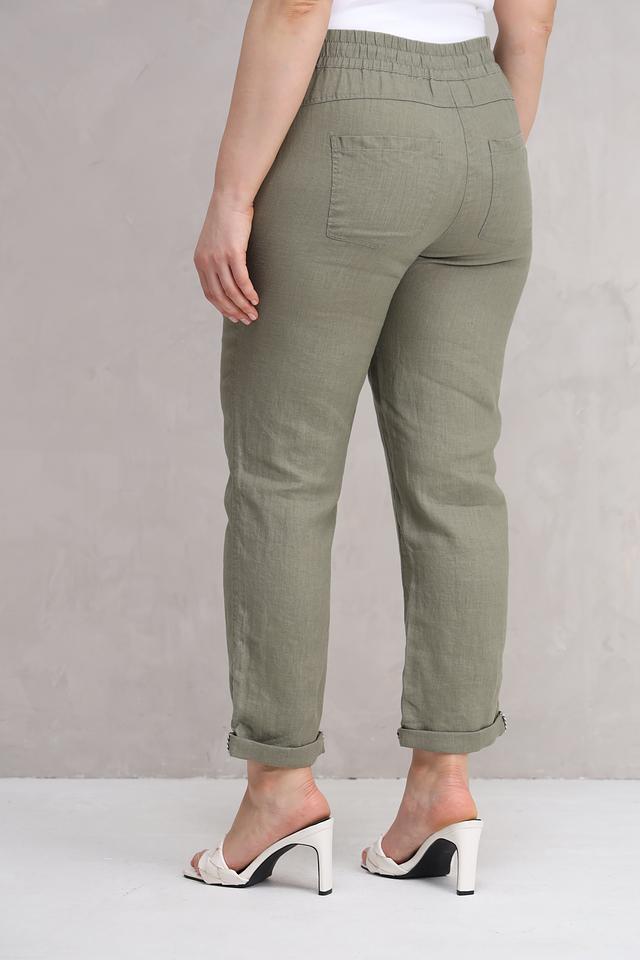 Льняная ткань приятна к телу, хорошо пропускает воздух и обладает отличными влагопоглощающими свойствами, что особенно актуально в жаркую погоду. Брюки цвета хаки легко сочетаются с различными элементами гардероба, позволяя создавать разнообразные образы.