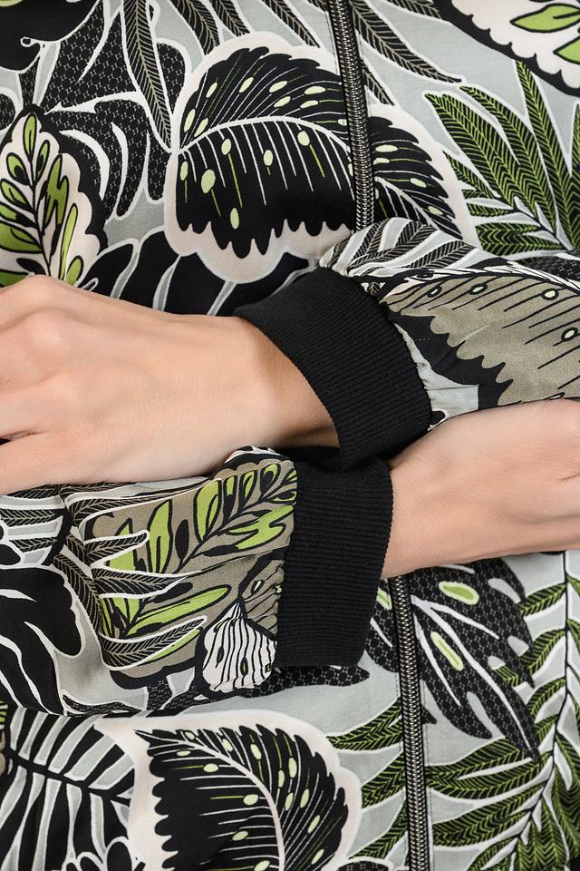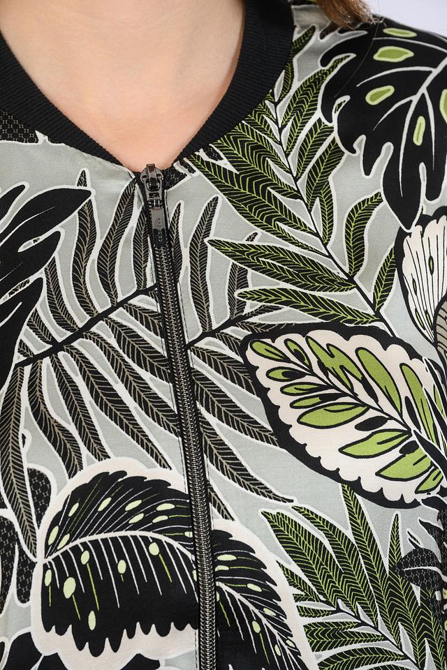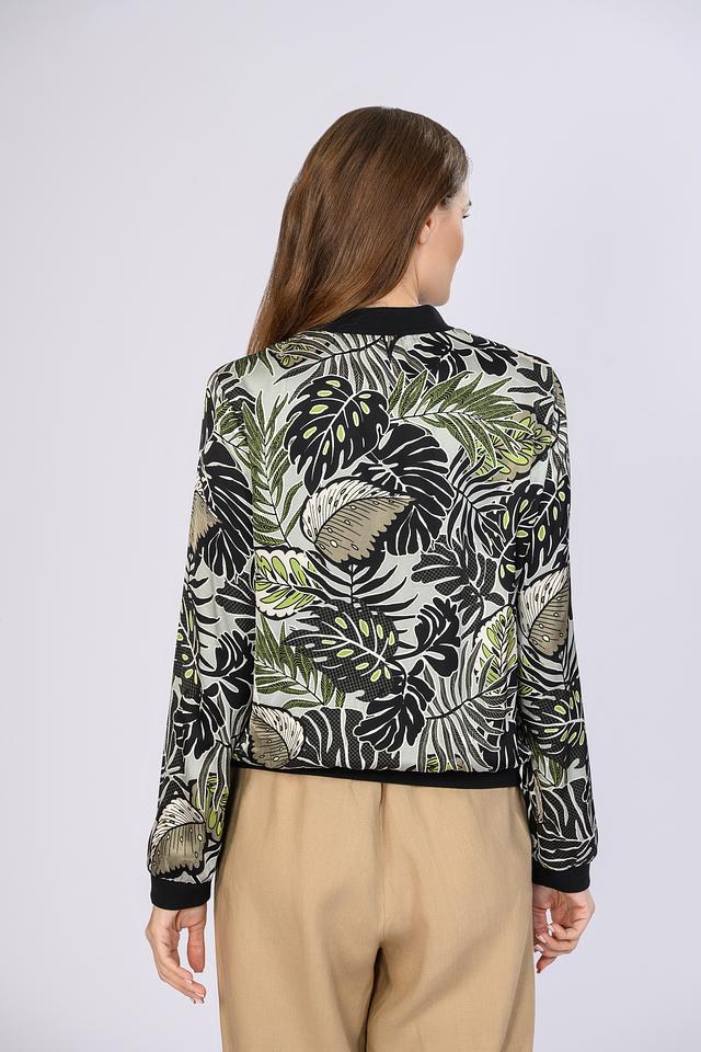 Основной цвет жакета – зеленый, но благодаря оригинальному тропическому принту с изображением листьев, он выглядит очень эффектно и свежо. Принт выполнен в сочетании черного, зеленого и бежевого цветов, что добавляет жакету динамичности.