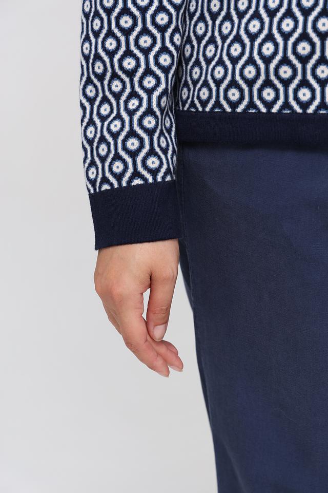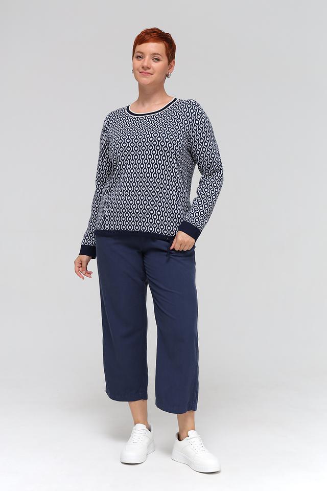Синий пуловер Olsen с геометрическим узором – стильная и комфортная модель для повседневного гардероба. Изготовлен из мягкого хлопка с добавлением акрила, что обеспечивает приятные тактильные ощущения и простоту в уходе. Состав: хлопок 50%, акрил 50%