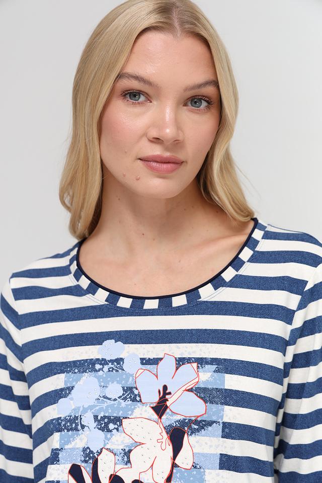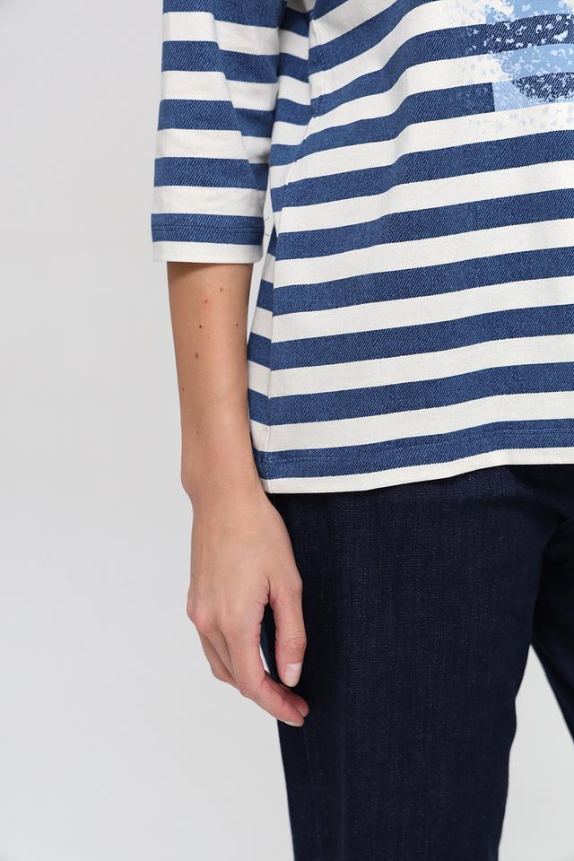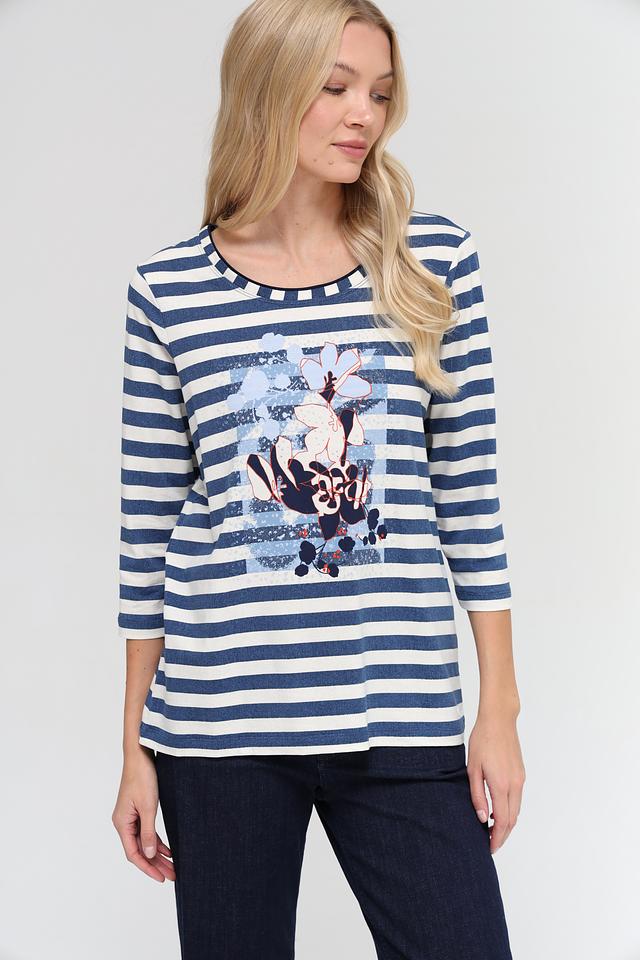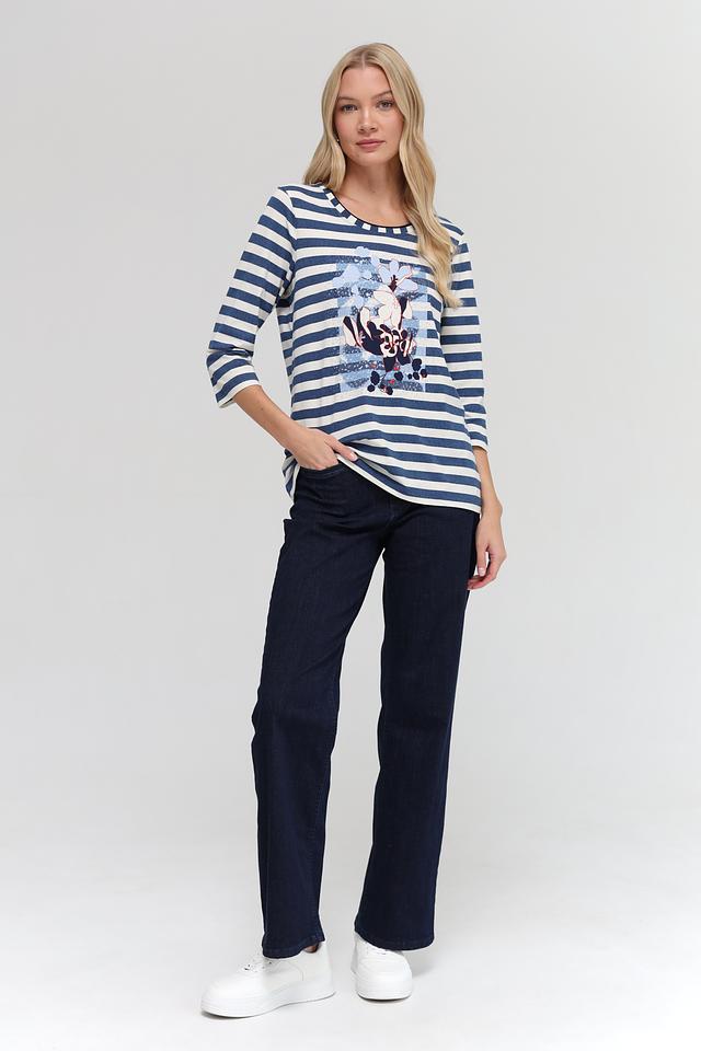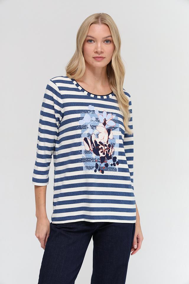 Женская футболка Olsen синего цвета с белыми полосами и цветочным принтом. Модель выполнена из мягкого хлопка с добавлением эластана, что обеспечивает комфорт и свободу движений. Футболка с 3/4 рукавом станет отличным дополнением к вашему гардеробу. Состав: хлопок 95%, эластан 5%
