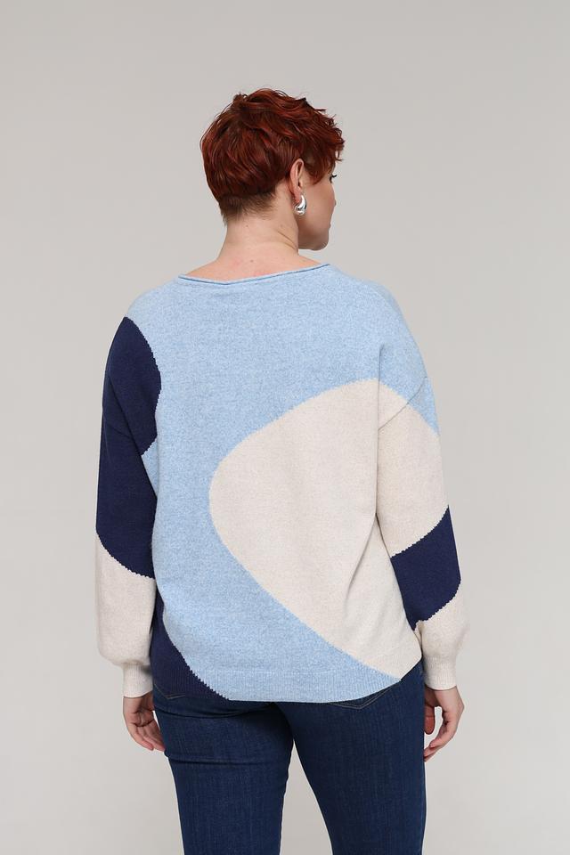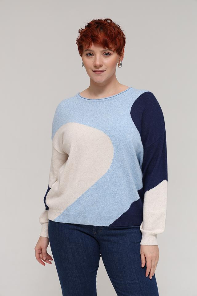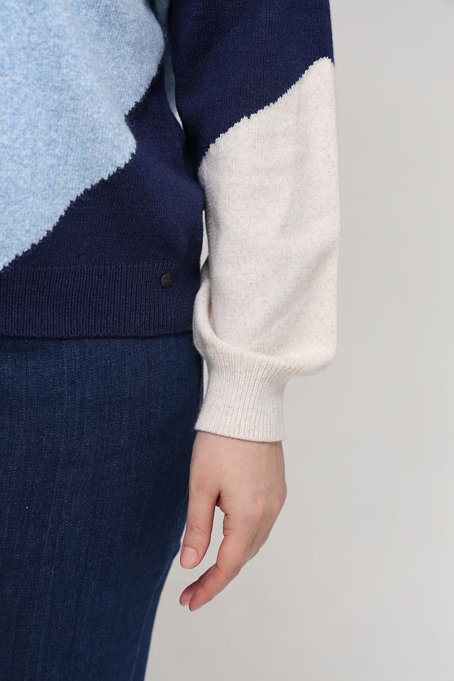 Этот стильный пуловер от бренда Olsen станет прекрасным выбором для создания уютного и модного образа. Пуловер выполнен в сочетании голубого, бежевого и тёмно-синего цветов с геометрическим рисунком, который придает ему оригинальность.