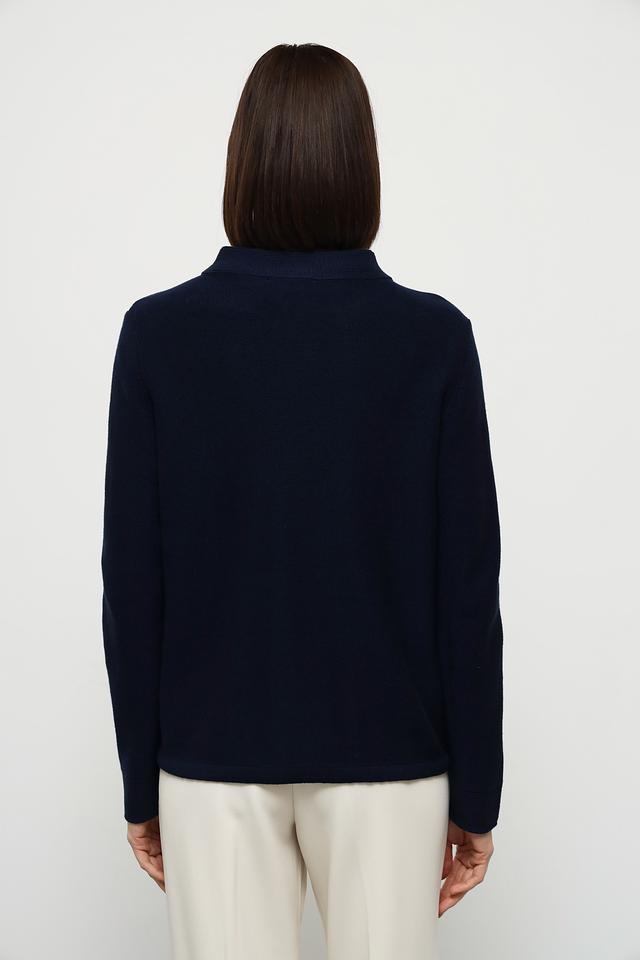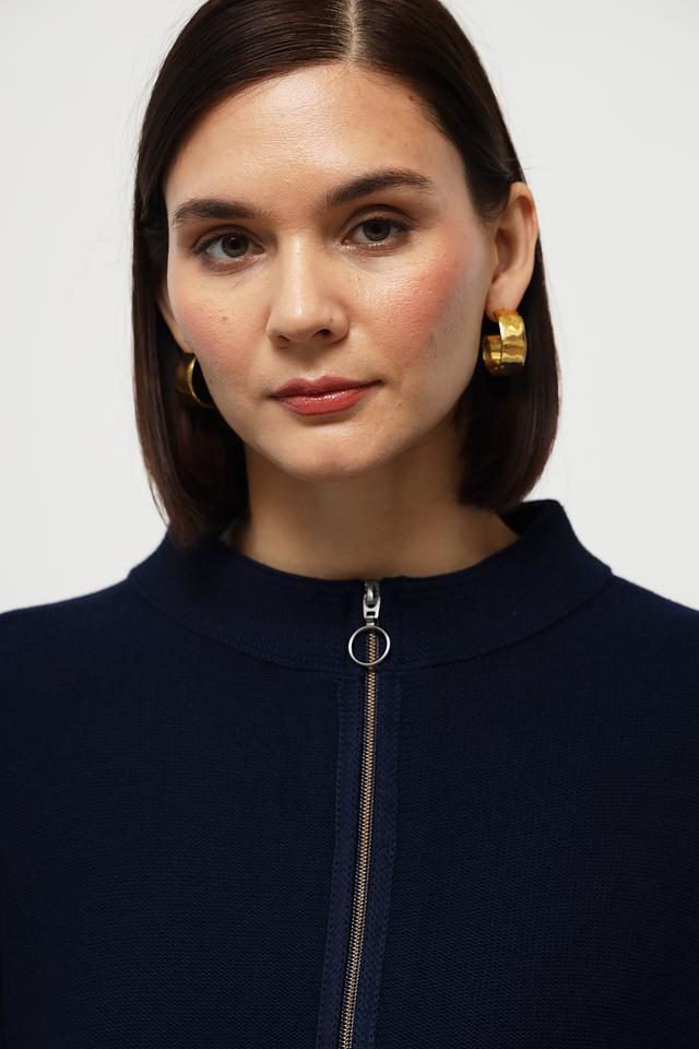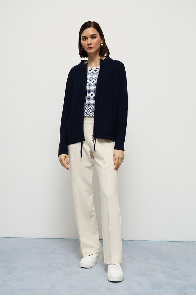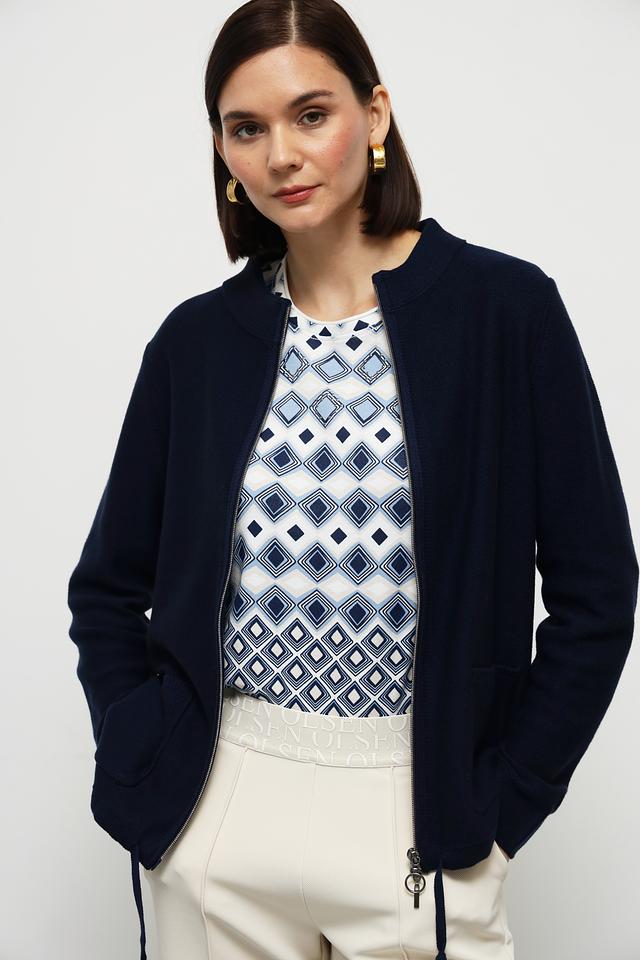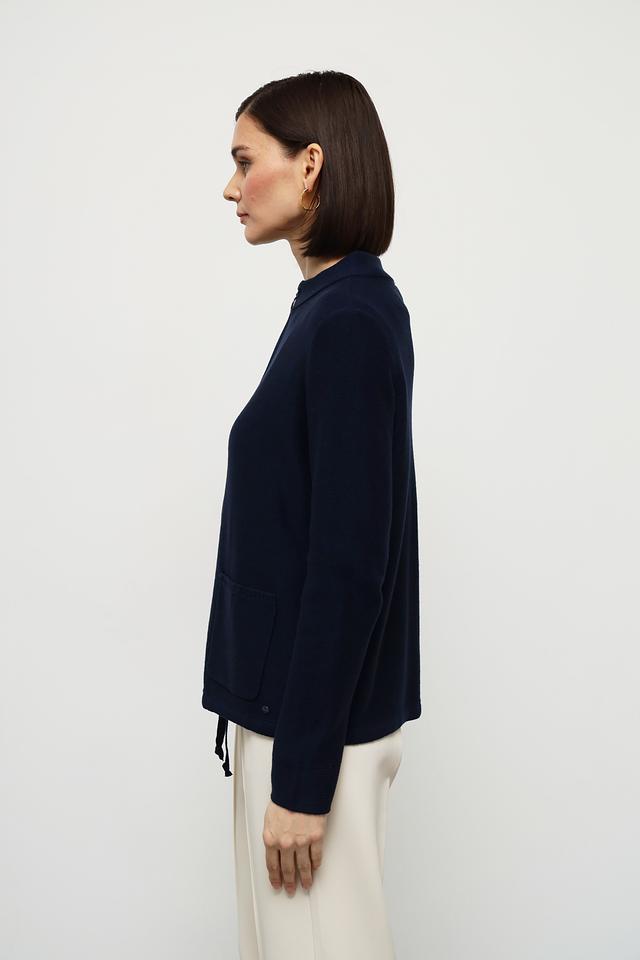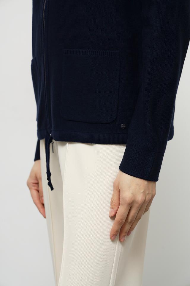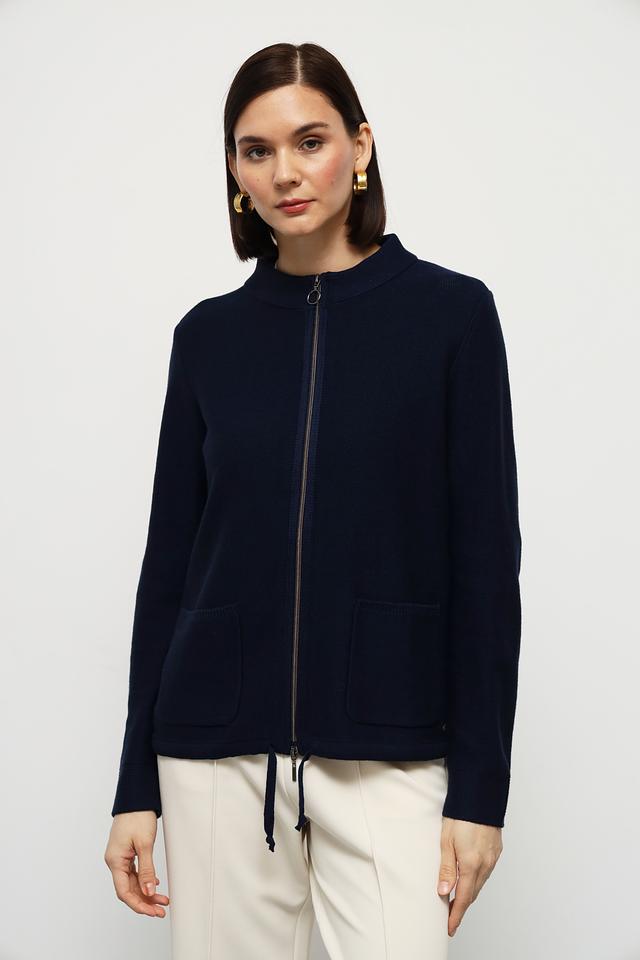 Тёмно-синий жакет от Olsen выполнен из мягкого трикотажа с хлопком и акрилом в составе. Модель застегивается на молнию, имеет два накладных кармана и шнурок на талии для регулировки силуэта. Состав: хлопок 50%, акрил 50%