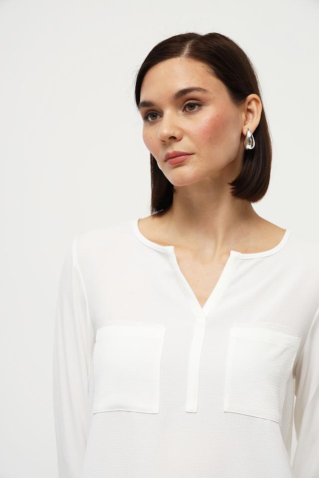 Блузка имеет прямой крой, длинные рукава и V-образный вырез горловины. На груди расположены два накладных кармана, которые добавляют образу функциональности и стиля.