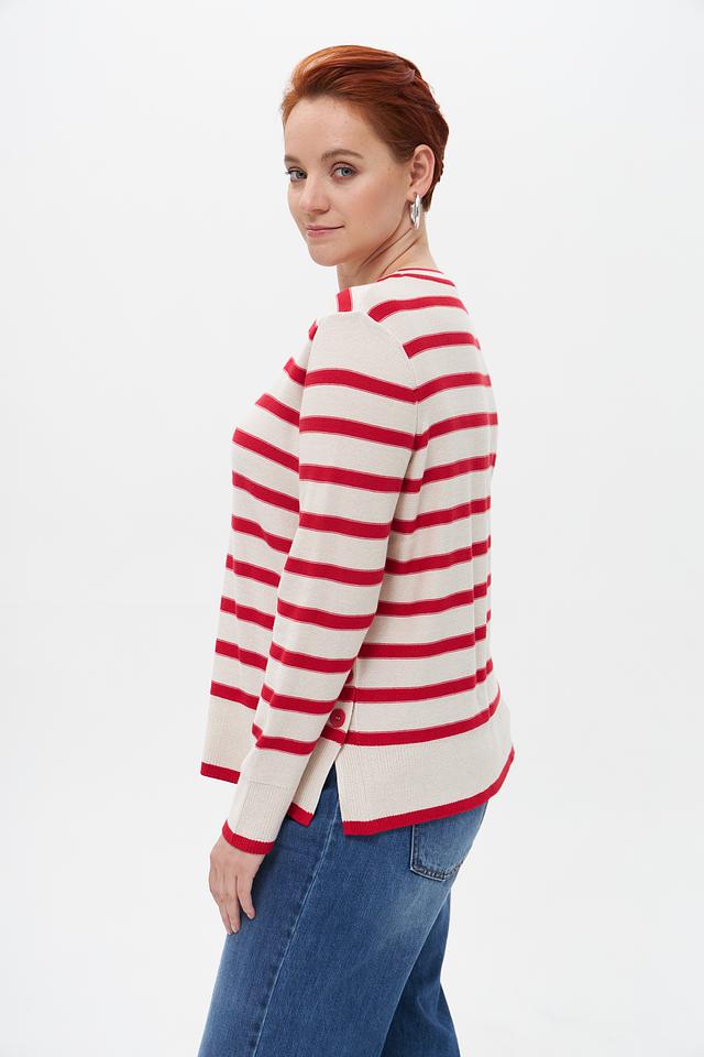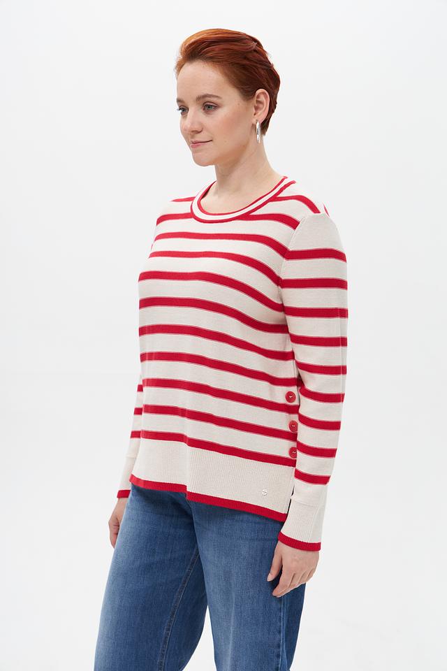 Женский пуловер от бренда Olsen выполнен в классическом стиле с полосатым узором. Преобладающий цвет – бежевый, полосы – красные. Модель имеет круглый вырез горловины и длинные рукава.