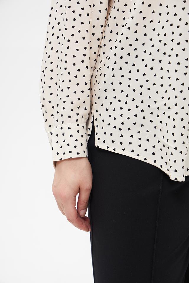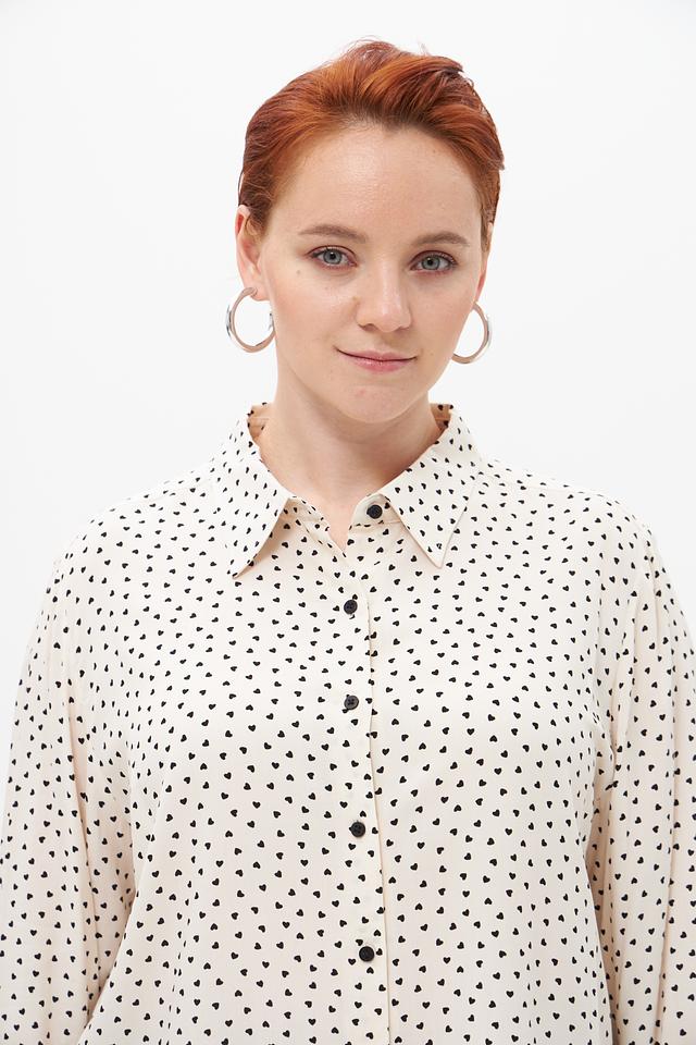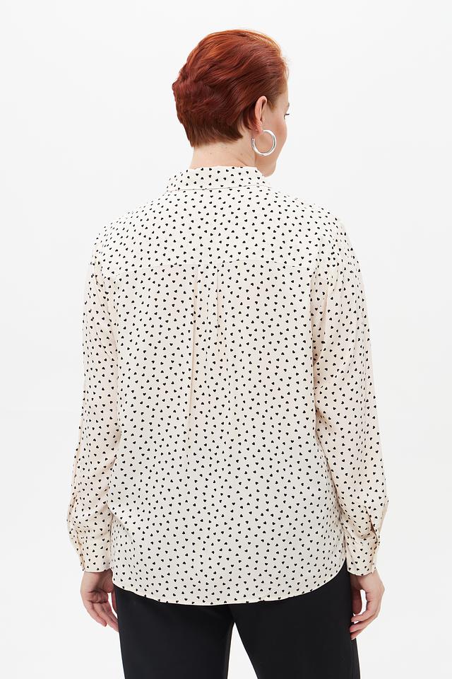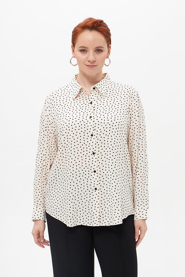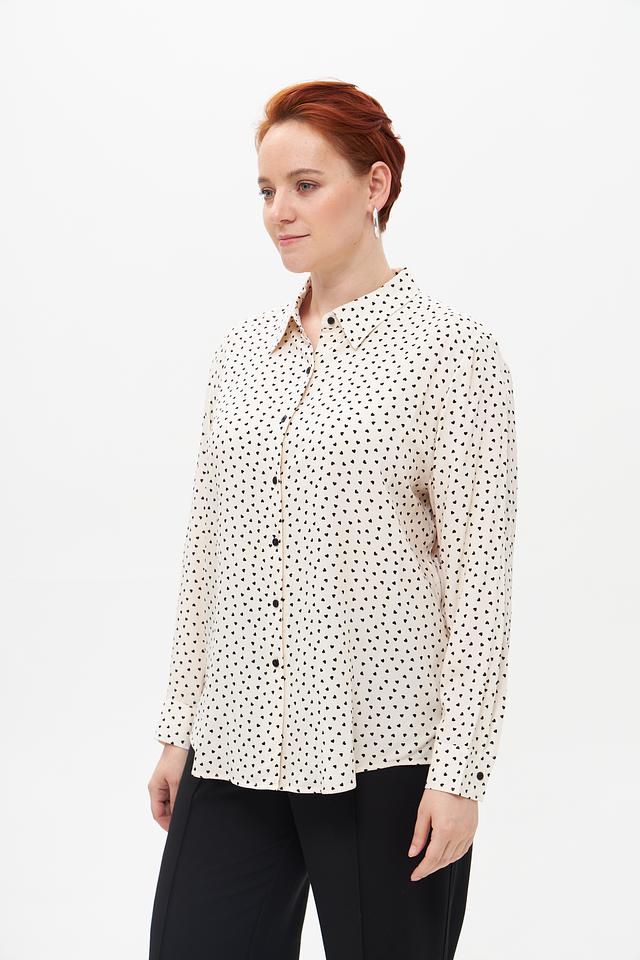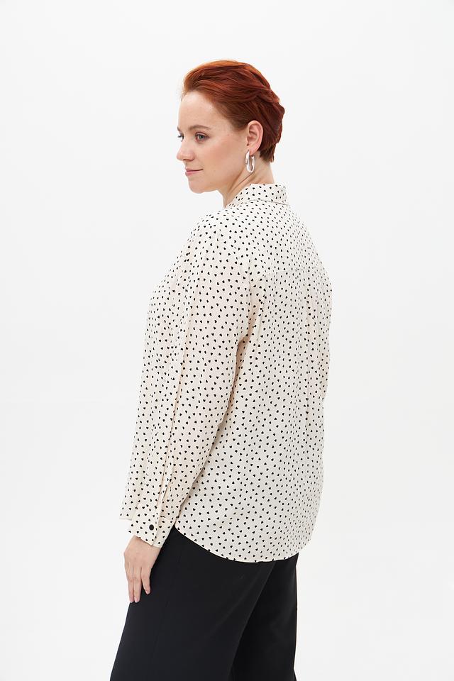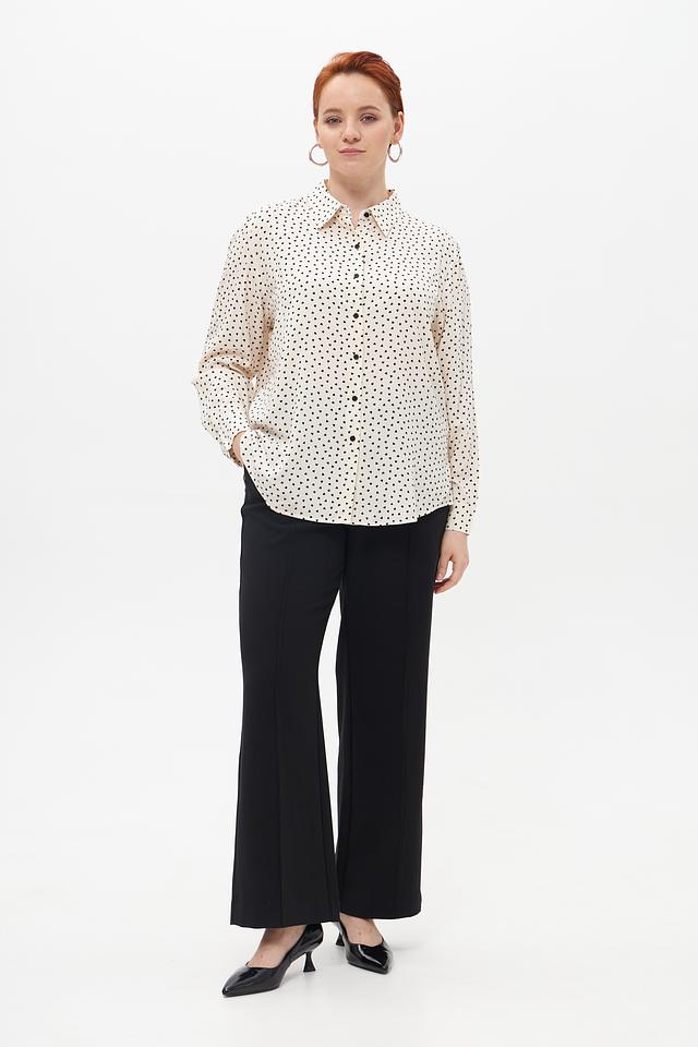 Блуза имеет классический крой с длинными рукавами и воротником рубашечного типа. Мелкий чёрный горошек на кремовом фоне придает ей элегантность и женственность. Застежка на пуговицы по всей длине позволяет регулировать степень прилегания.