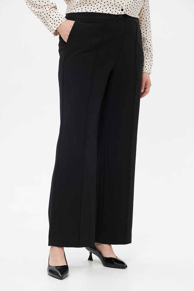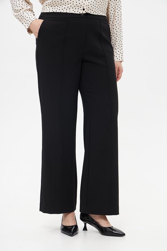Брюки имеют прямой крой и широкие штанины, что обеспечивает комфорт и свободу движений. Высокая посадка визуально удлиняет ноги и подчеркивает талию. Застёжка на молнию и пуговицу, а также боковые карманы добавляют функциональности.