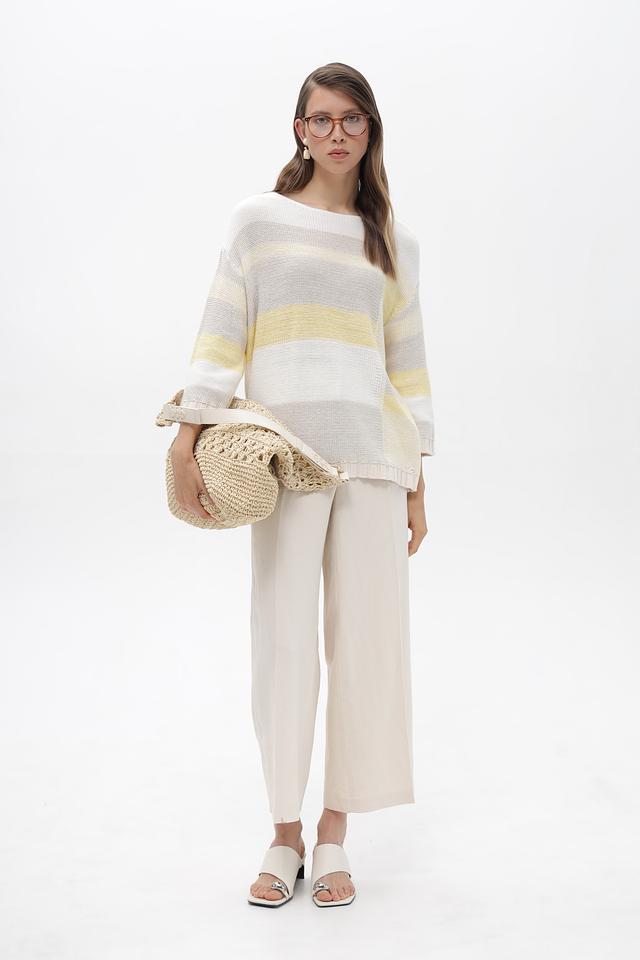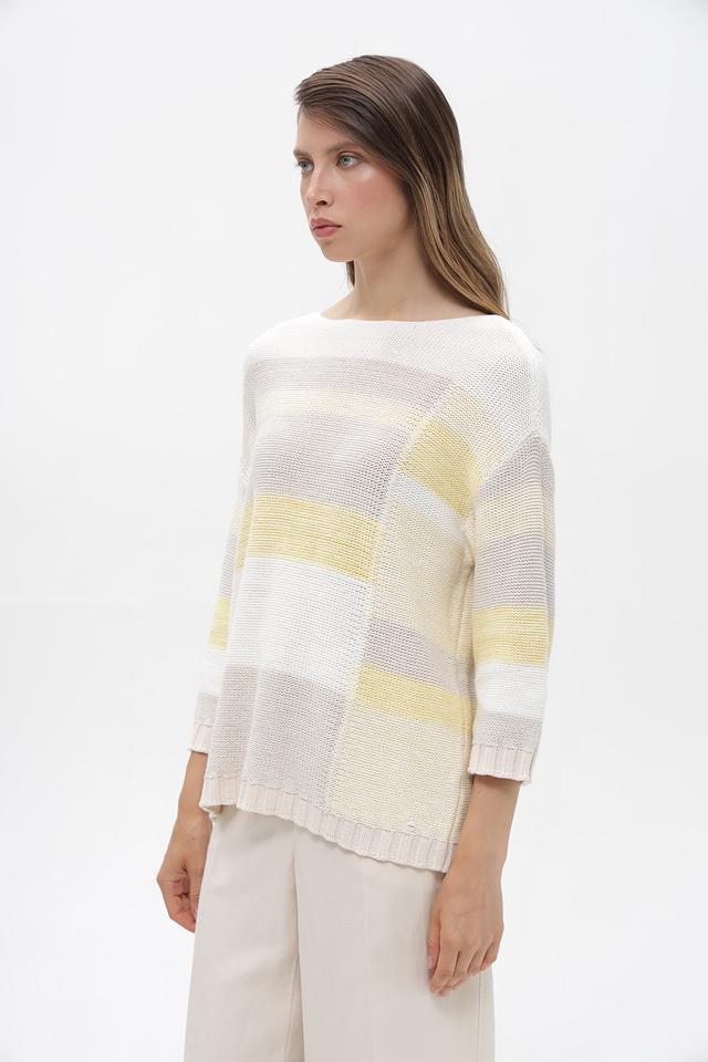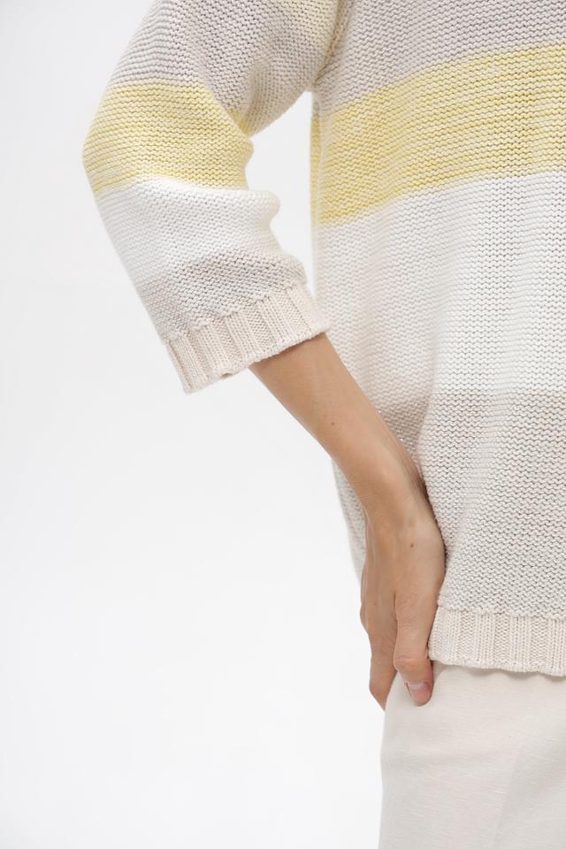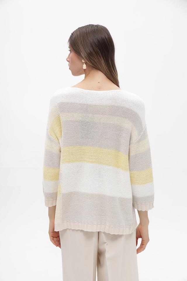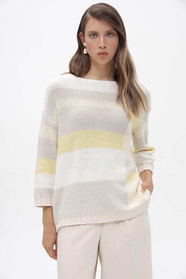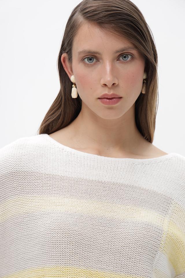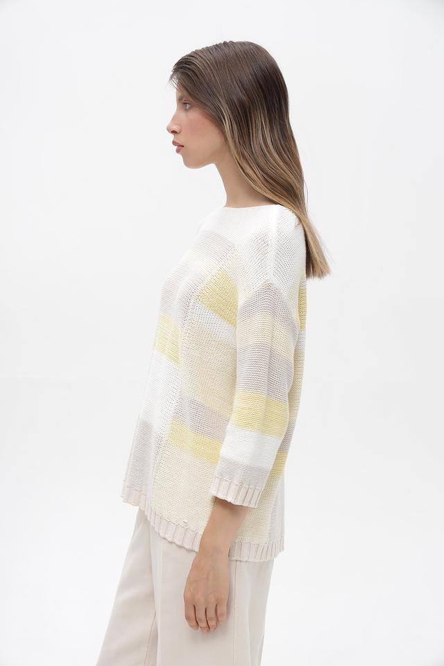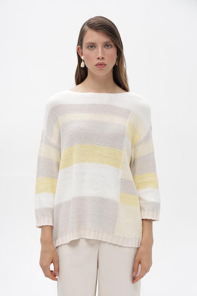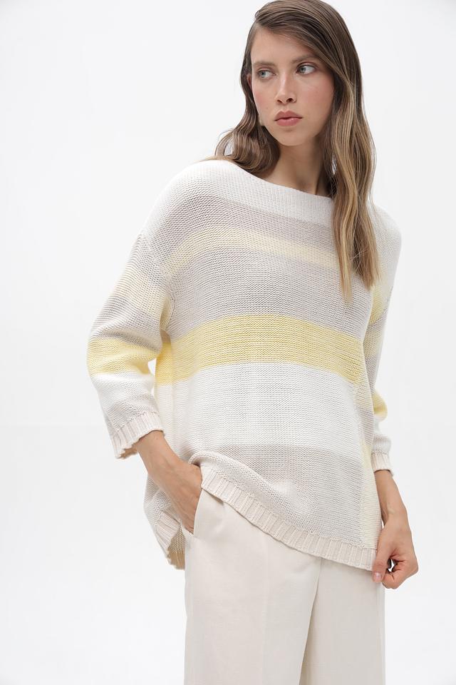 Женский пуловер от бренда Olsen выполнен в белом цвете с горизонтальными полосами светло-жёлтого и серого оттенков. Модель имеет свободный крой и длину до бедер, что обеспечивает комфорт в носке.