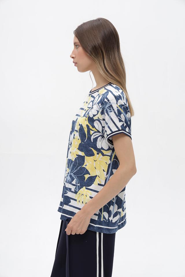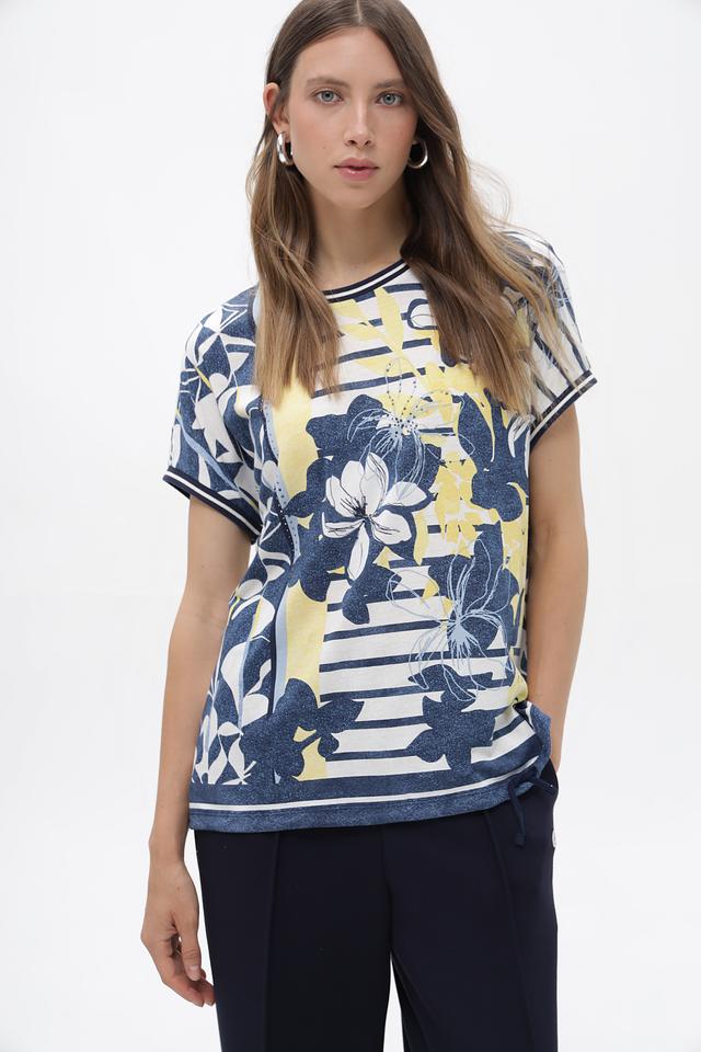 Женская футболка от бренда Olsen – это стильное и комфортное решение для создания повседневных образов. Модель выполнена в сочетании синего, белого и жёлтого цветов и украшена крупным цветочным принтом, придающим ей особый шарм.