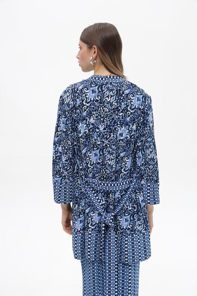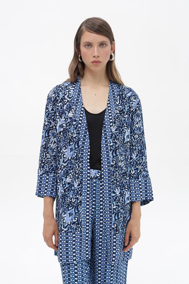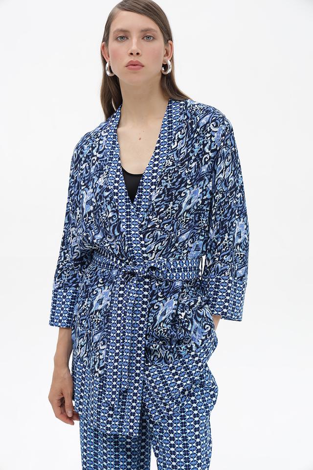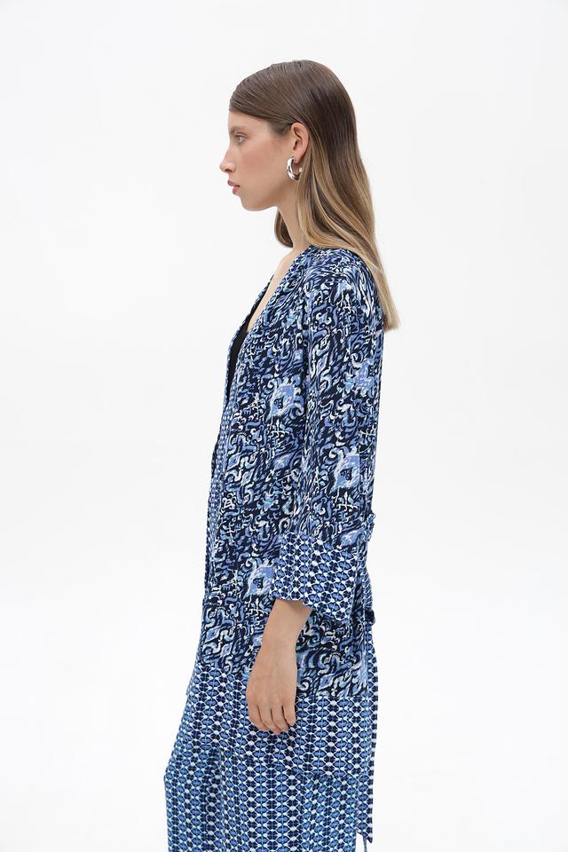 Синий жакет Olsen с оригинальным принтом и поясом. Изготовлен из мягкой вискозы, обеспечивающей комфорт в носке. Идеально дополнит ваш повседневный или вечерний образ. Состав: вискоза 100%