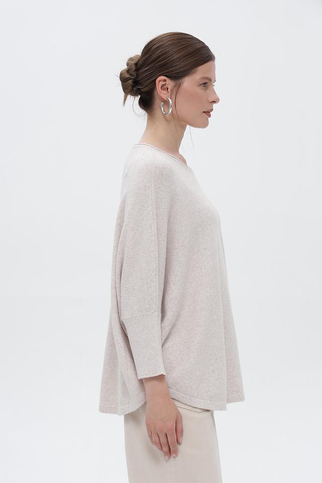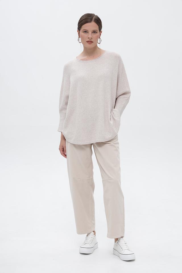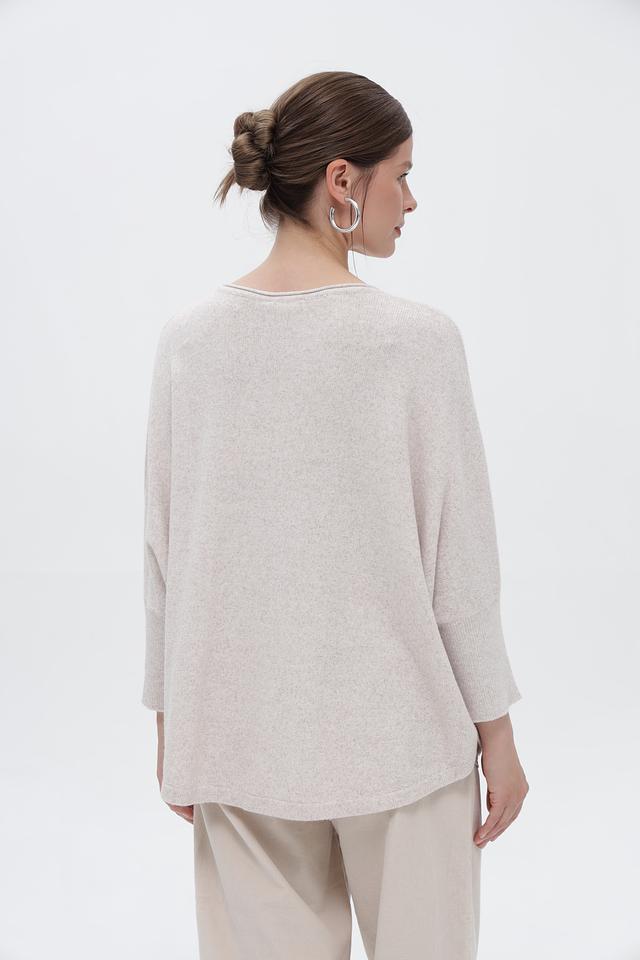Округлый вырез горловины аккуратно обработан и дополнен контрастной окантовкой, что придает изделию изысканность. Рукава ¾ делают этот пуловер универсальным для любого времени года.