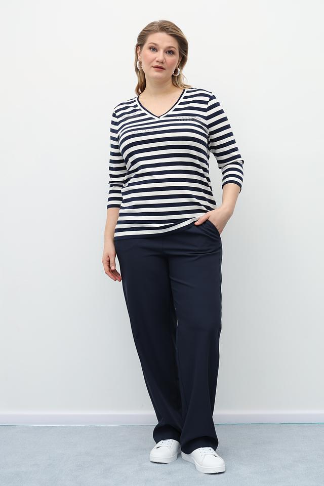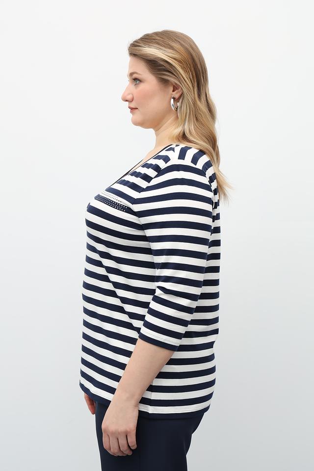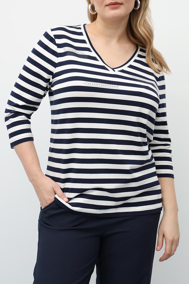 Футболка имеет классический V-образный вырез горловины и рукав длиной 3/4. Дизайн изделия выполнен в виде горизонтальных полос синего и белого цветов. Дополнительным акцентом служат декоративные элементы в области плеч и груди, выполненные в виде мелких страз.