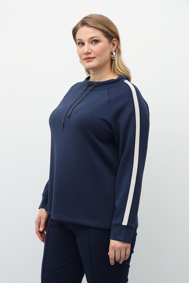 Пуловер имеет свободный крой, что позволяет чувствовать себя свободно и непринужденно. Декоративные белые полосы по бокам добавляют динамичности и спортивного шика. Модель дополнена капюшоном со шнурком для удобства регулировки.