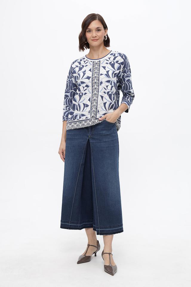 Блуза имеет прямой крой и короткий рукав 3/4, что делает ее универсальной для различных образов. Особенностью модели является яркий и запоминающийся цветочный принт в сине-белой гамме, который добавит свежести и оригинальности вашему стилю.