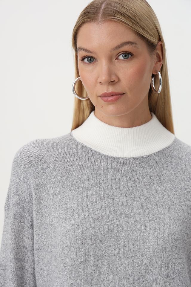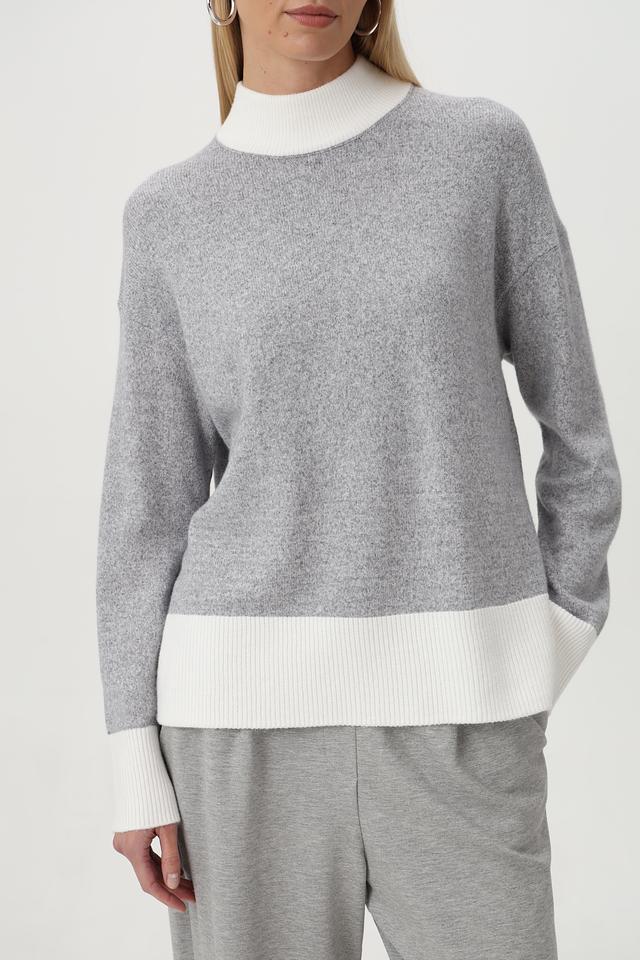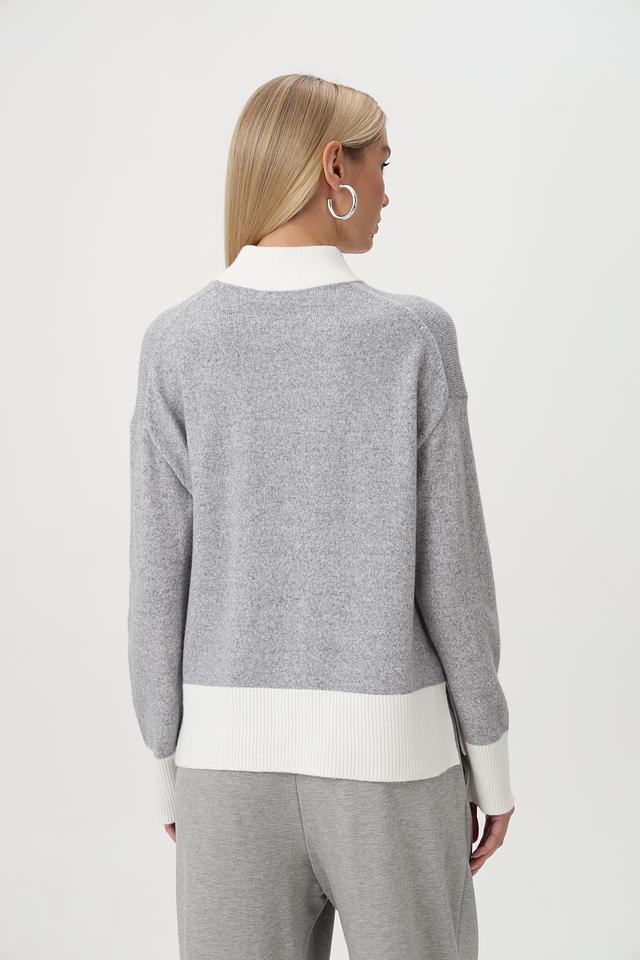 Пуловер имеет серый цвет с контрастной белой отделкой на горловине, манжетах и нижней части изделия. Это придает ему особый шарм и делает его более интересным.