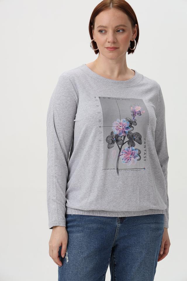 Модель имеет прямой, слегка свободный крой, длинные рукава и круглый вырез горловины. Основной цвет лонгслива – серый меланж, который легко сочетается с различными элементами гардероба.