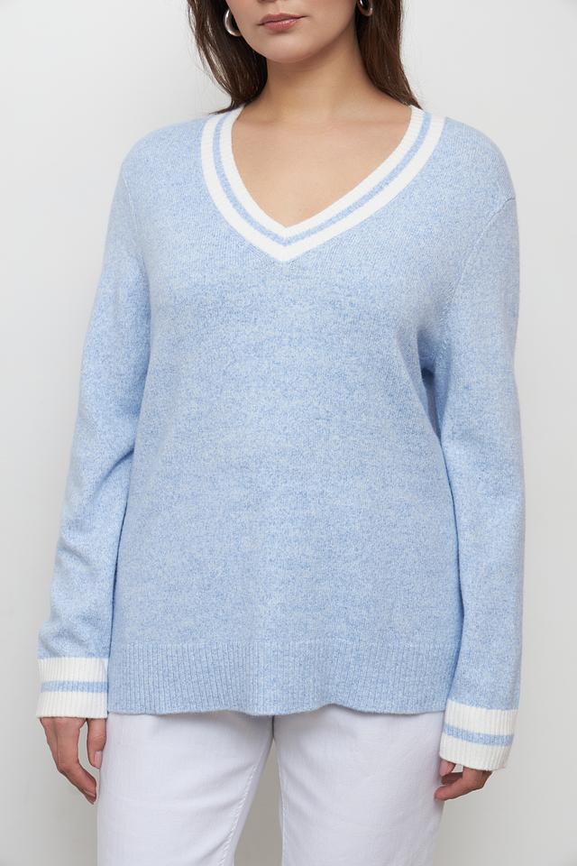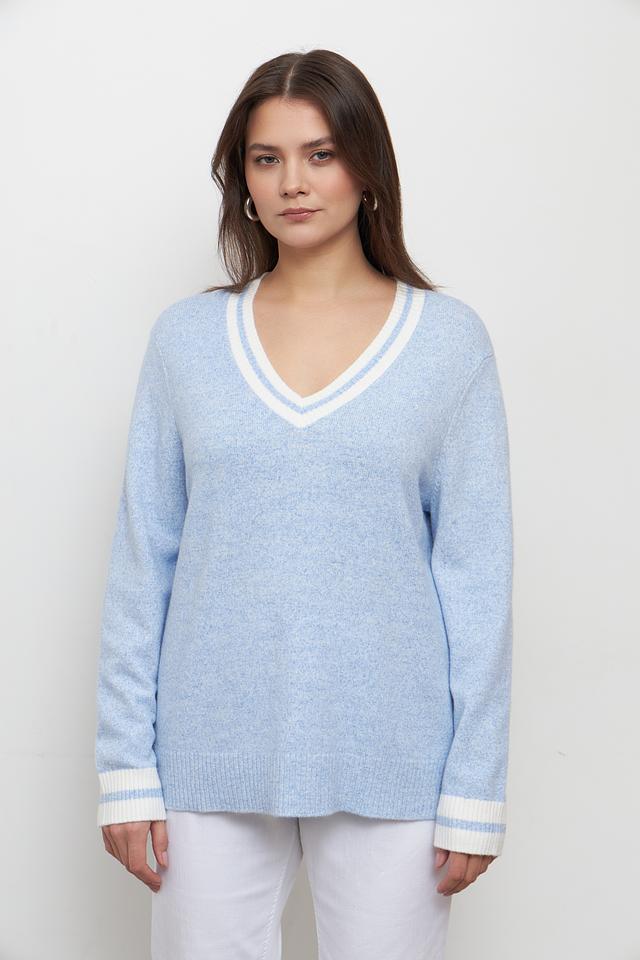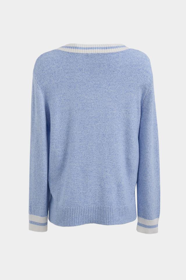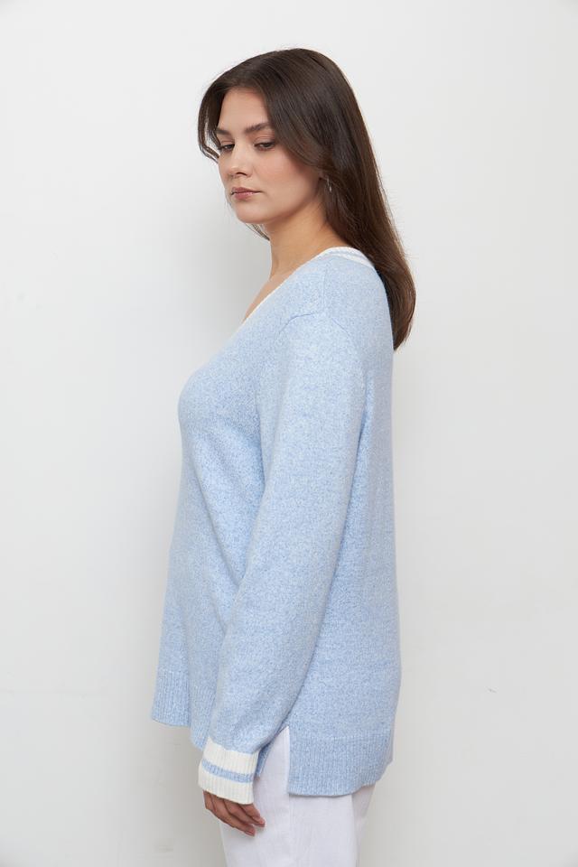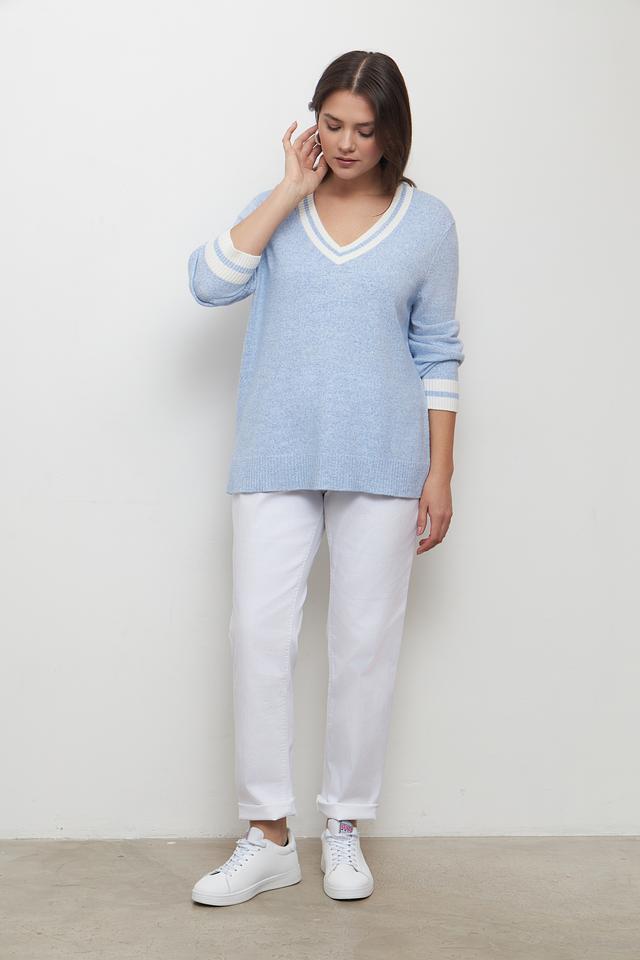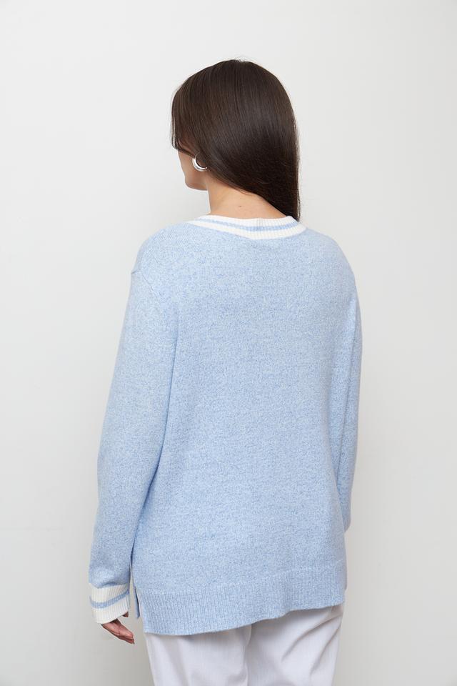 Пуловер имеет голубой цвет и классический V-образный вырез, который подчеркивает линию шеи. Белая отделка по вырезу и на манжетах придает модели особый шарм и делает ее более интересной.