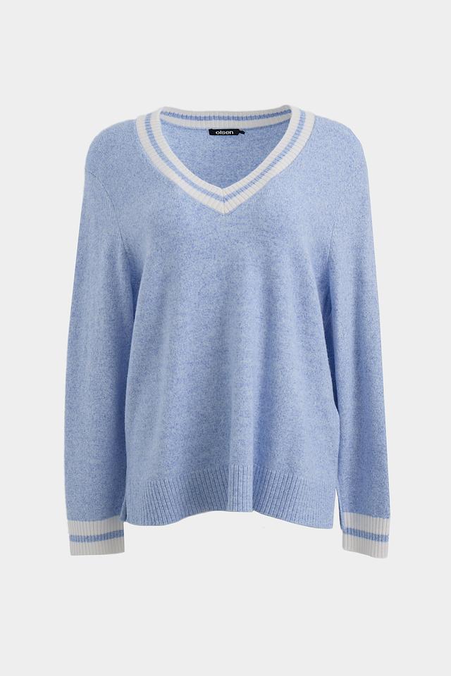 Женский пуловер Olsen голубого цвета с V-образным вырезом и белой отделкой. Изготовлен из мягкого трикотажа, имеет свободный крой и короткие манжеты с полоской. Идеальный выбор для создания комфортного и стильного образа. Состав: вискоза 52%, полиэстер 28%, полиамид 20%