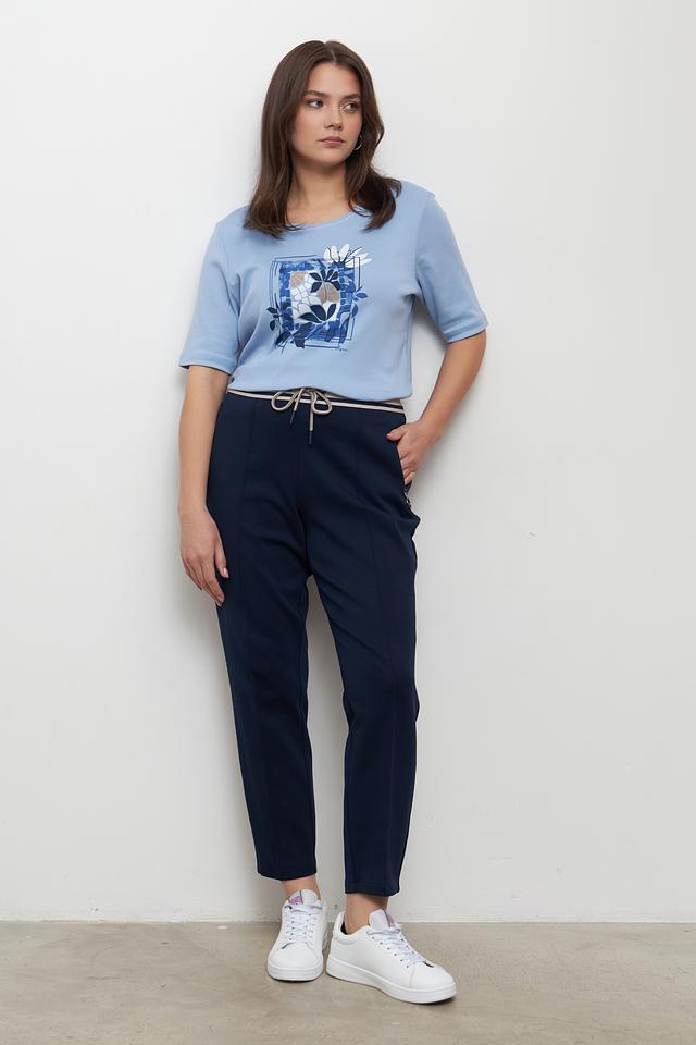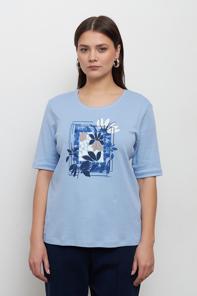 Футболка имеет прямой крой и короткие рукава, что делает ее идеальной для теплой погоды. Особенностью модели является яркий цветочный принт, выполненный в синих и белых тонах, который добавляет образу свежести и оригинальности.