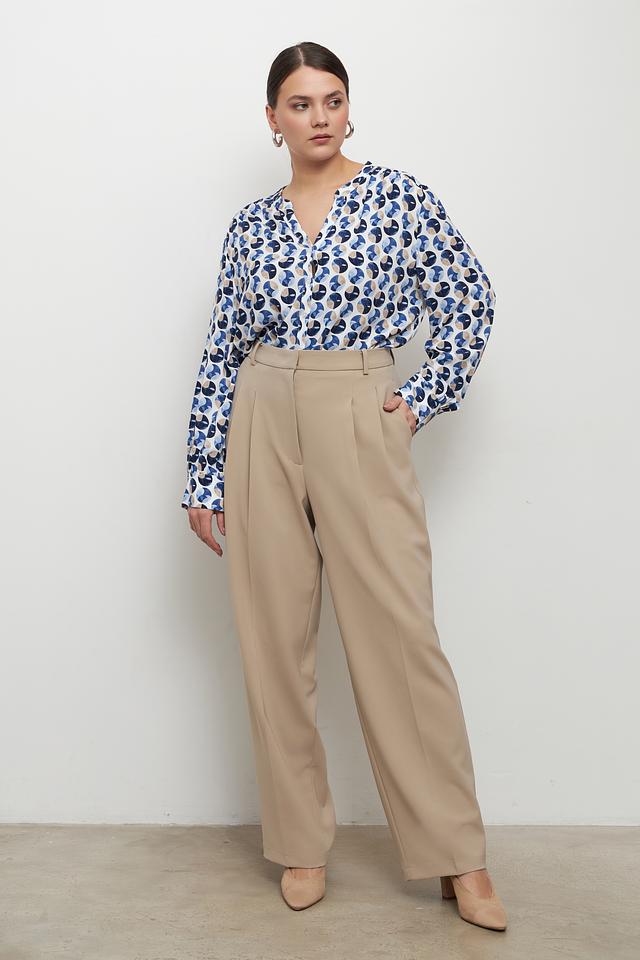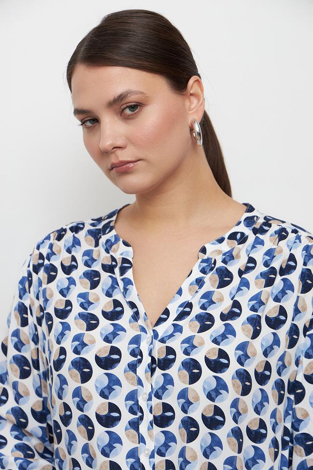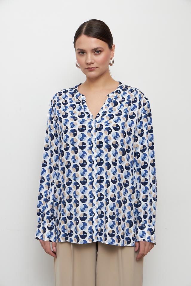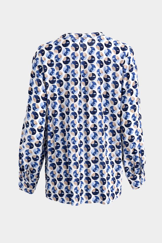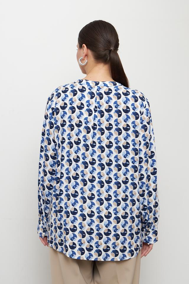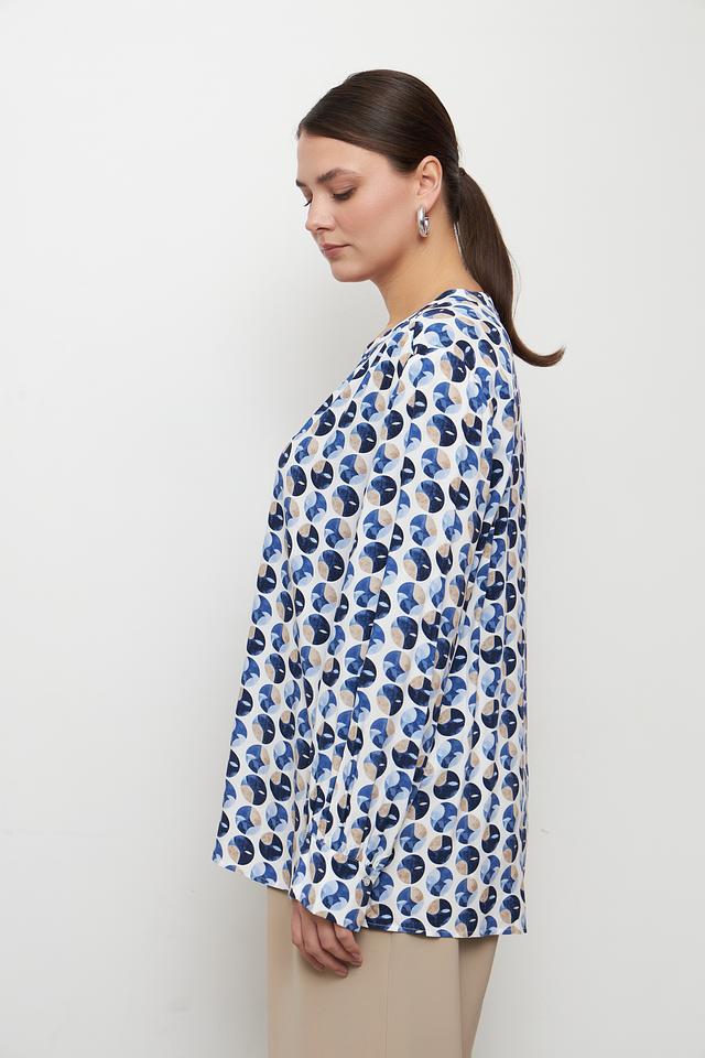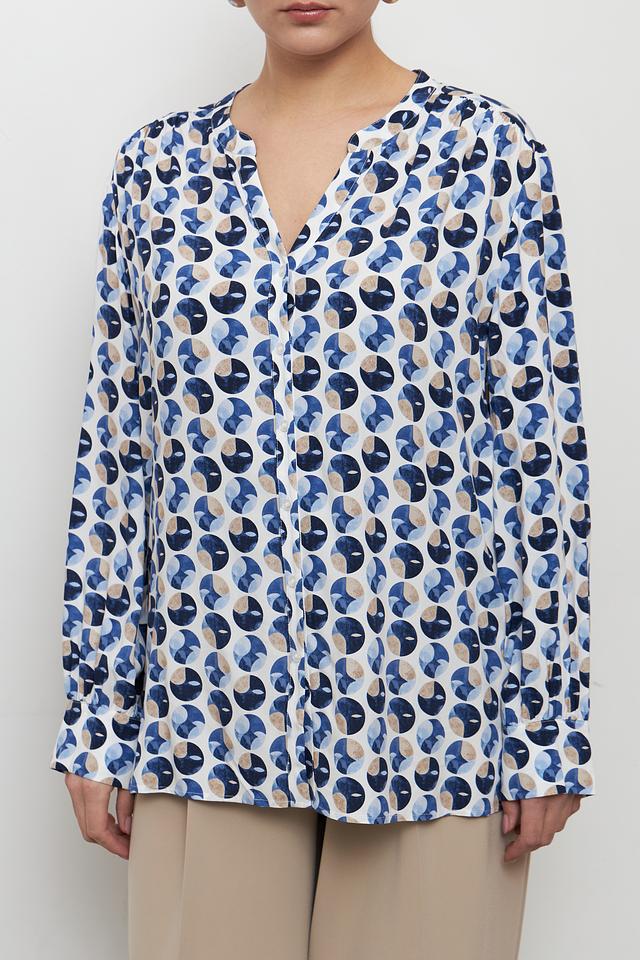 Особенностью этой модели является яркий геометрический принт, выполненный в сочетании синих, белых и бежевых оттенков. Такой рисунок добавит вашему образу оригинальности и индивидуальности. Длинные рукава делают блузу подходящей для прохладной погоды.