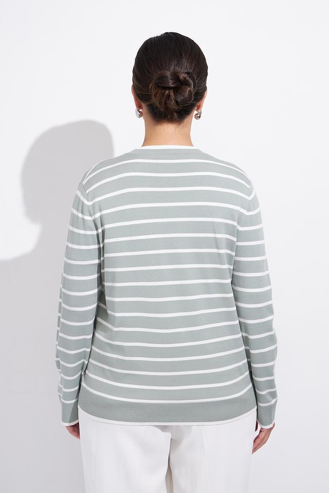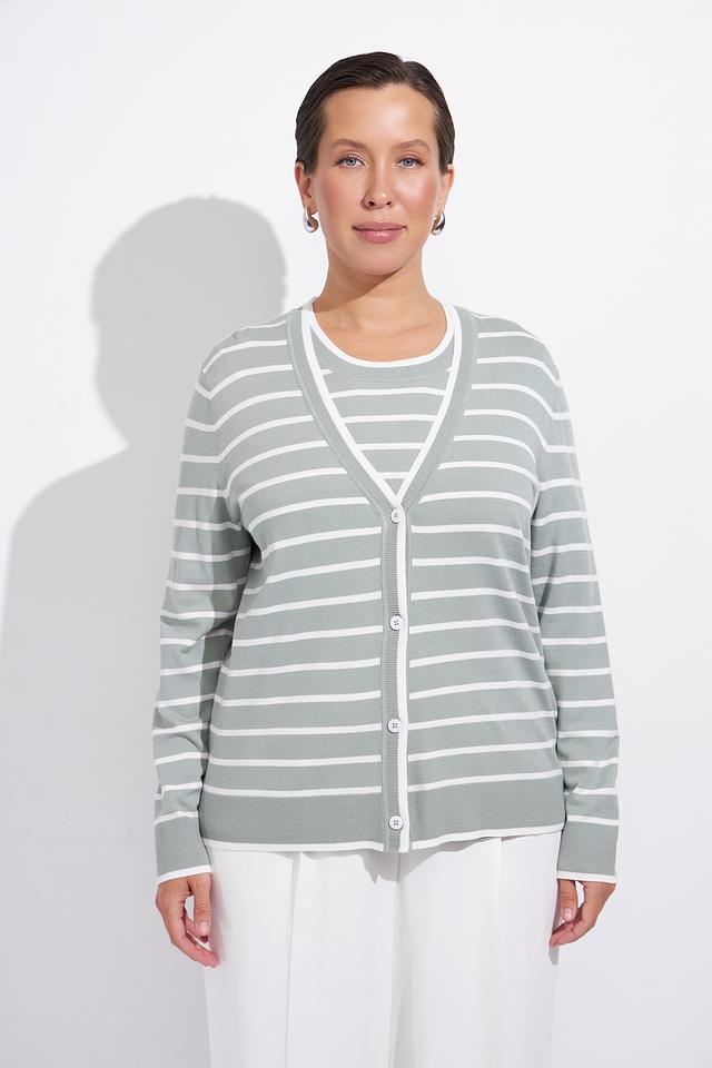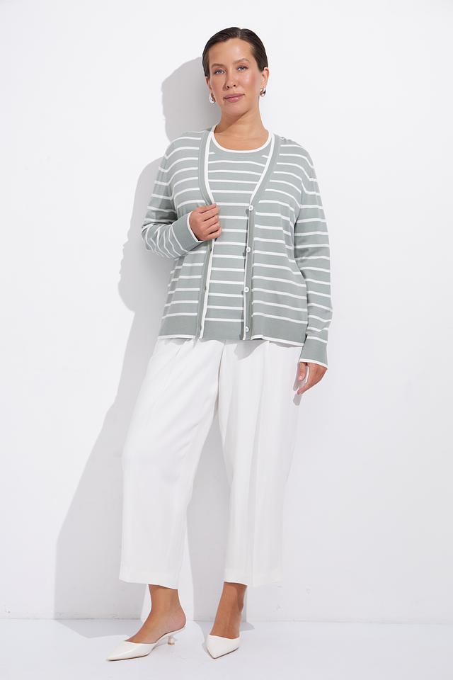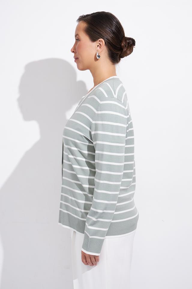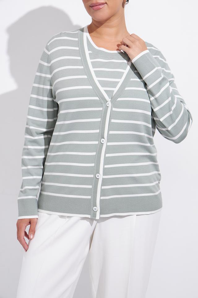 Этот жакет от Olsen станет отличным дополнением к вашему гардеробу. Модель выполнена в нежном мятном цвете с классическим полосатым рисунком, который визуально освежает образ.