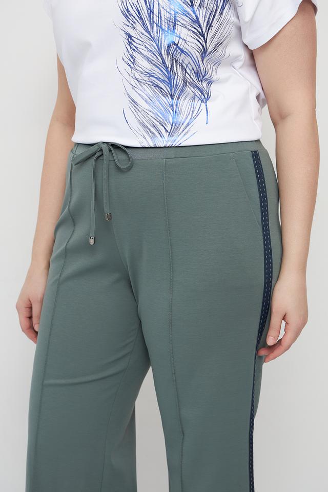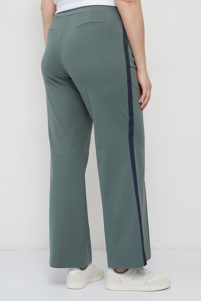 Брюки имеют прямую посадку и стандартную длину, что делает их универсальными для разных типов фигуры. Отличительной особенностью является контрастная полоса по боковому шву, добавляющая образу динамичности и стиля. Застежка – молния и пуговица.
