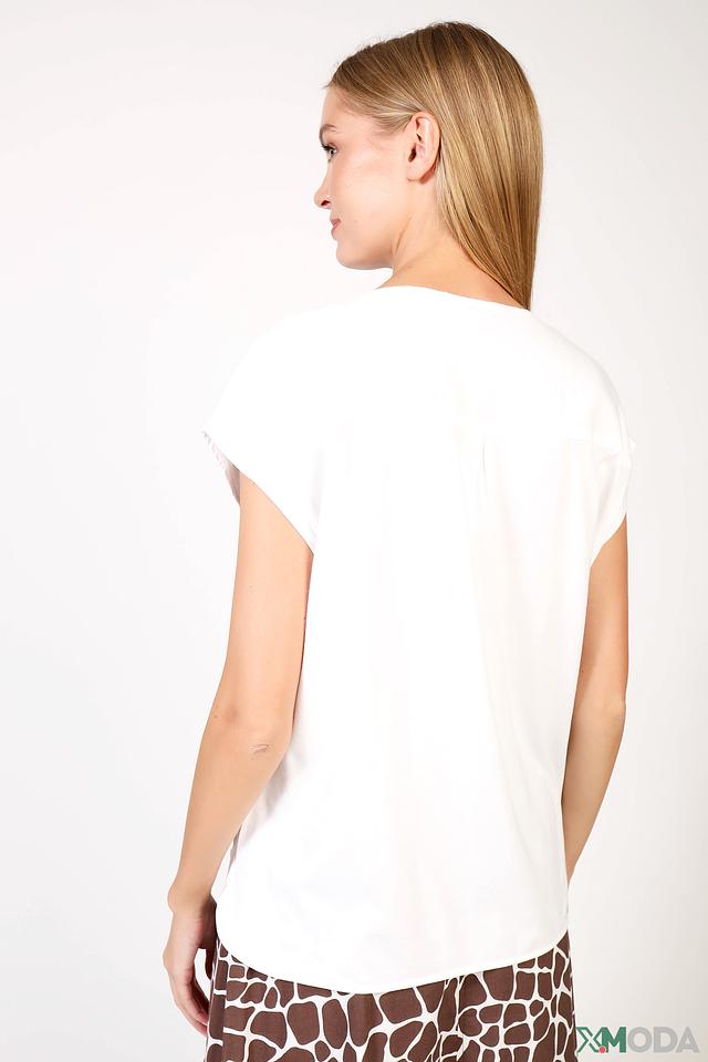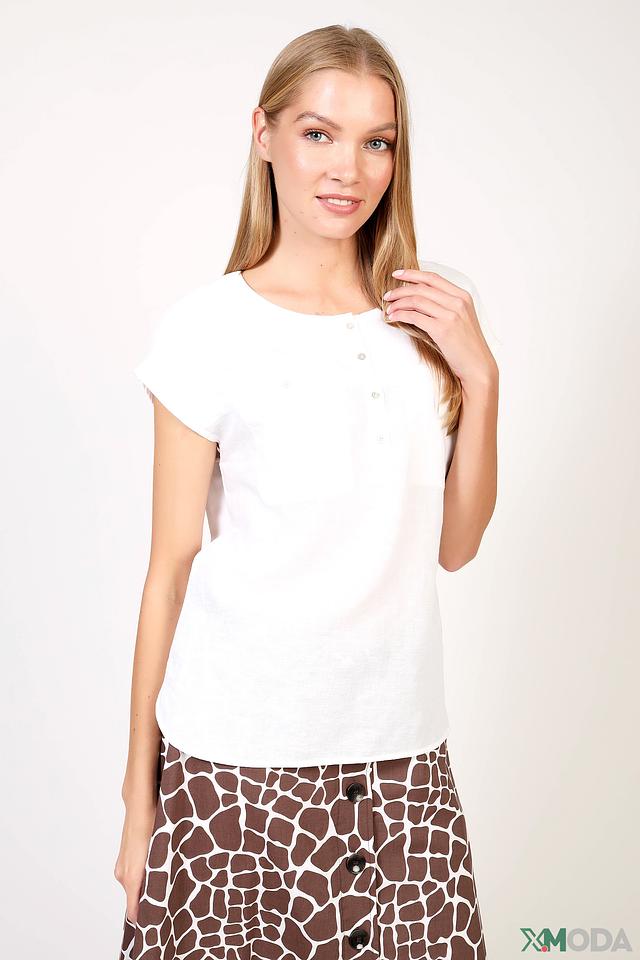 Белая блуза от Olsen с короткими рукавами-воланами и V-образным вырезом. Изготовлена из лёгкой ткани с добавлением льна и модала, что обеспечивает комфорт и воздухопроницаемость. Состав: лен 36%, модал 14%