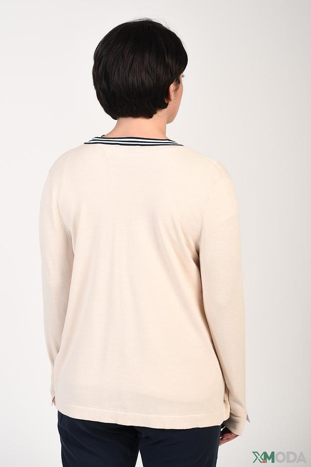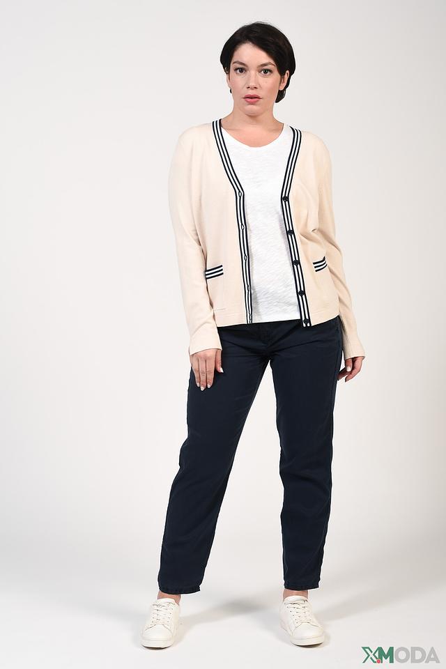 Особенностью модели являются контрастные полоски темно-синего цвета на рукавах и полочках, которые добавляют динамики и стиля. Жакет выполнен из мягкой и приятной к телу ткани, состоящей из вискозы и полиэстера.
