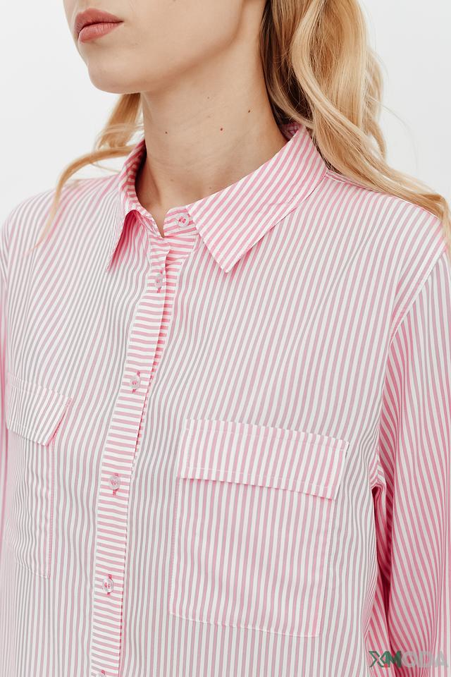 Рубашка имеет классический крой с длинными рукавами и отложным воротником. Она оформлена в светлую полоску, сочетающую розовый и белый цвета, что придает ей свежий и женственный вид. На груди расположены накладные карманы, добавляющие функциональности и стиля.