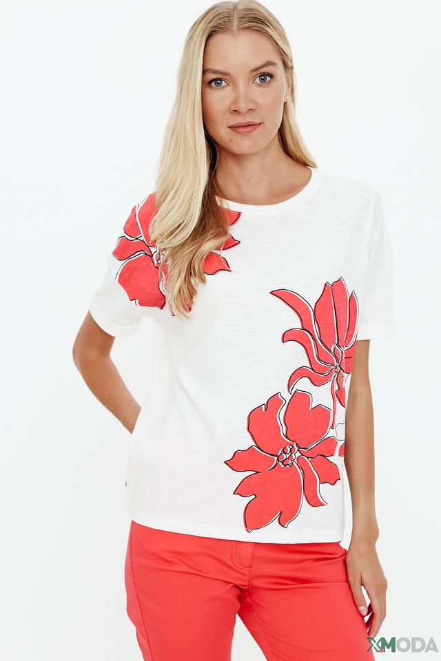 Белая футболка Olsen с ярким цветочным принтом. Изготовлена из 100% хлопка, обеспечивая комфорт и воздухопроницаемость. Стильный и лёгкий вариант для повседневного образа. Состав: хлопок 100%