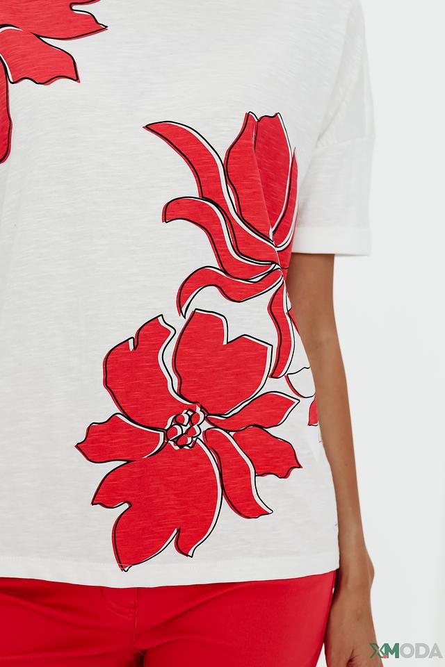 Особенностью данной модели является яркий принт в виде красных цветов, который добавляет образу свежести и женственности. Футболка имеет прямой крой и короткие рукава, что делает её идеальным выбором для тёплой погоды.
