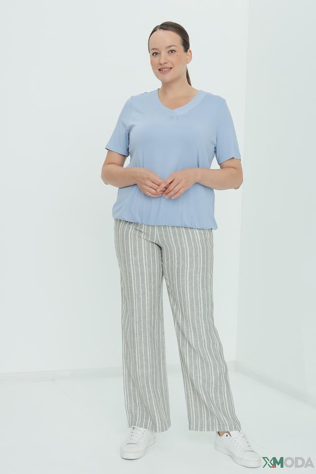 Брюки имеют классический крой с завышенной талией и прямыми штанинами. Вертикальная полоска визуально вытягивает силуэт и делает фигуру более стройной. Удобный пояс на кулиске позволяет регулировать посадку по фигуре.