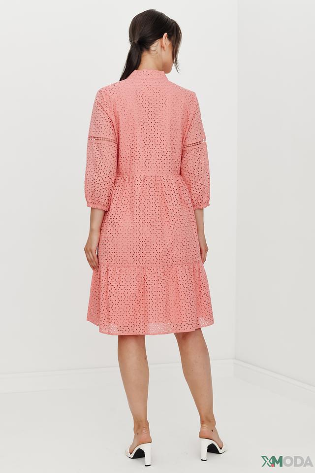 Платье Olsen нежно-персикового цвета выполнено из хлопка с перфорацией. Модель имеет V-образный вырез, короткие рукава и многоярусную юбку, что придает ей лёгкость и воздушность. Состав: хлопок 100%, Состав_подкладка хлопок 100%