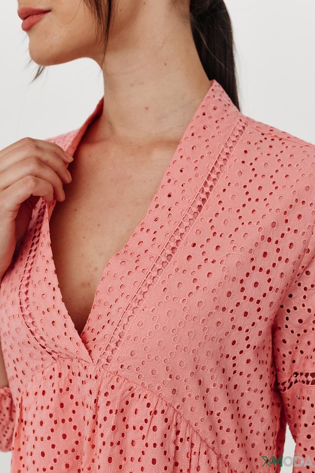 Платье имеет нежно-персиковый цвет и украшено мелкой перфорацией по всей поверхности, создающей ажурный эффект. V-образный вырез горловины и короткие рукава добавляют образу женственности и лёгкости.