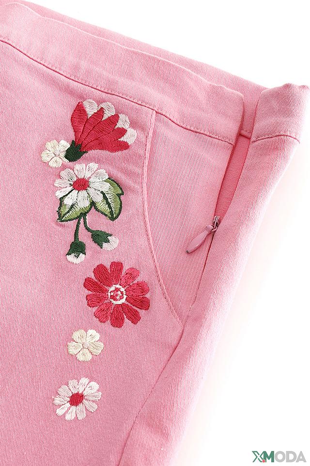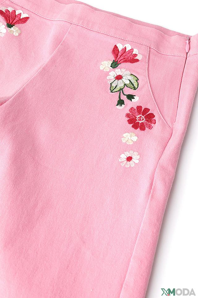 Брюки имеют прямой крой и укороченную длину, что делает их идеальными для теплой погоды. Эластичный пояс обеспечивает удобную посадку и не стесняет движений. Особый акцент сделан на декоративную вышивку в виде ярких цветов, расположенную на передней части брюк. Вышивка выполнена в красных, белых и зеленых тонах, создавая игривый и привлекательный образ.
