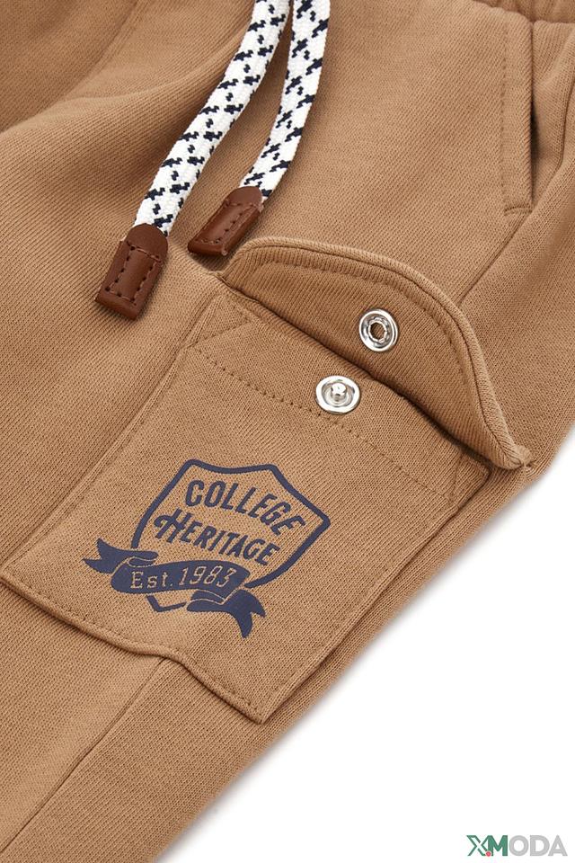 Брюки имеют удобный эластичный пояс с регулирующим шнурком, обеспечивающим надежную посадку. Наличие боковых карманов добавляет функциональности. Декоративный принт на кармане придает брюкам индивидуальность.