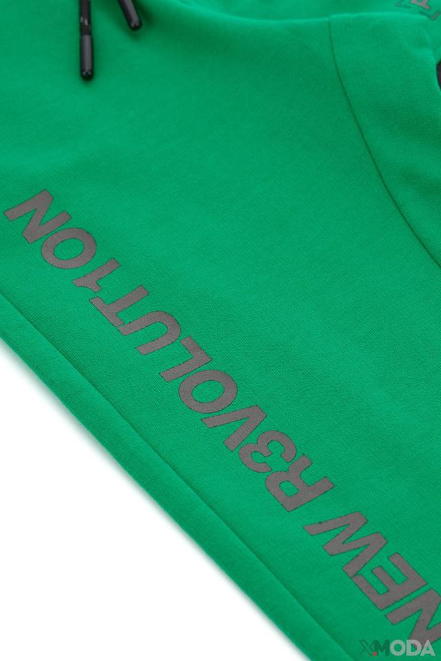 Брюки имеют удобный эластичный пояс с регулируемым шнурком, манжеты внизу штанин и боковой карман на молнии. Декорированы брюки надписями "NEW REVOLUTION" вдоль левой штанины и "POWERED" на правой. Такой дизайн придаёт им современный и спортивный вид.