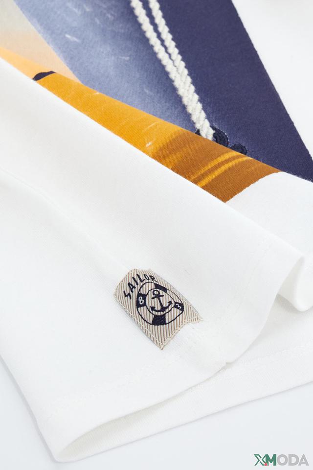 Дизайн лонгслива выполнен в морской тематике: на передней части изображён якорь, парусник и полосы, создающие яркий и запоминающийся образ. Воротник и манжеты рукавов выполнены в виде рибаны с небольшим узором.