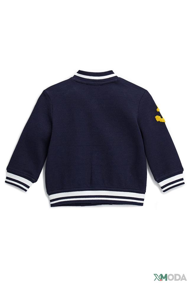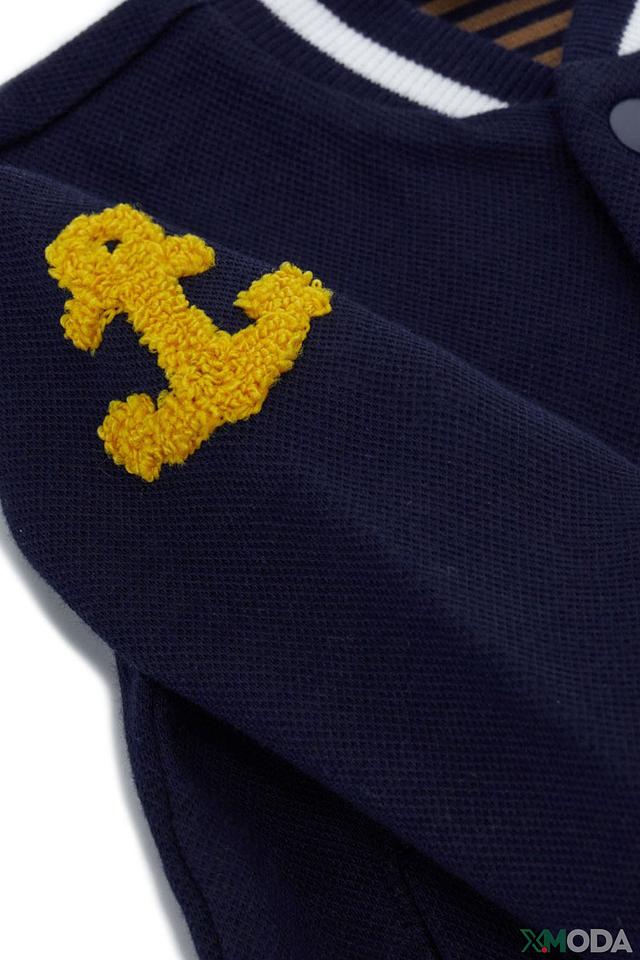 Кардиган выполнен в классическом синем цвете, украшен яркими нашивками в виде буквы "M" и якоря, что придает ему игривый и запоминающийся вид. Застежка на пуговицы позволяет легко надевать и снимать кардиган, а эластичные манжеты и нижний край обеспечивают комфортную посадку.