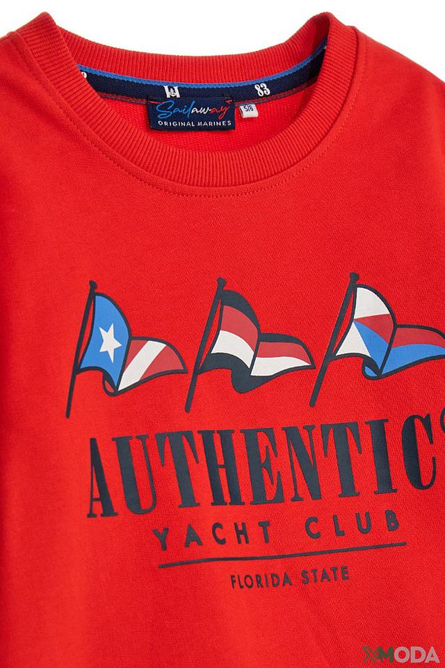 Джемпер имеет классический крой с круглым вырезом горловины и манжетами на рукавах. Главная деталь – яркий принт в виде развевающихся флагов и надписи "AUTHENTIC YACHT CLUB", который придаёт комплекту динамичный и спортивный вид. Материал джемпера – 100% хлопок, что обеспечивает комфорт и мягкость при носке.