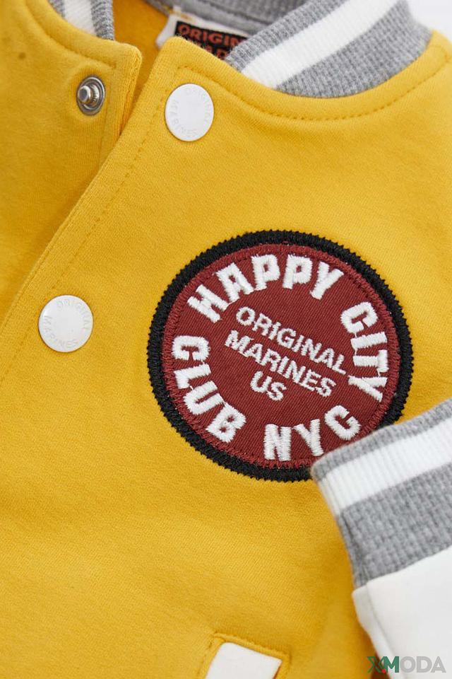 Яркая жёлтая толстовка от Original Marines для мальчиков, украшенная принтами и нашивками. Модель выполнена в стиле спортивного бомбера с застёжкой на пуговицы и манжетами в полоску. Состав: хлопок 95%, Состав_2 хлопок 85%, Состав_2 вискоза 10%, эластан 5%, Состав_2 эластан 5%