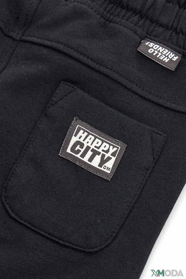 Дизайн брюк дополнен яркими жёлтыми шнурками на талии, которые придают образу игривость и индивидуальность. На левой штанине расположен оригинальный принт в виде кроссовок, добавляющий стильный акцент. На заднем кармане размещена декоративная вставка с надписью "HAPPY CITY".