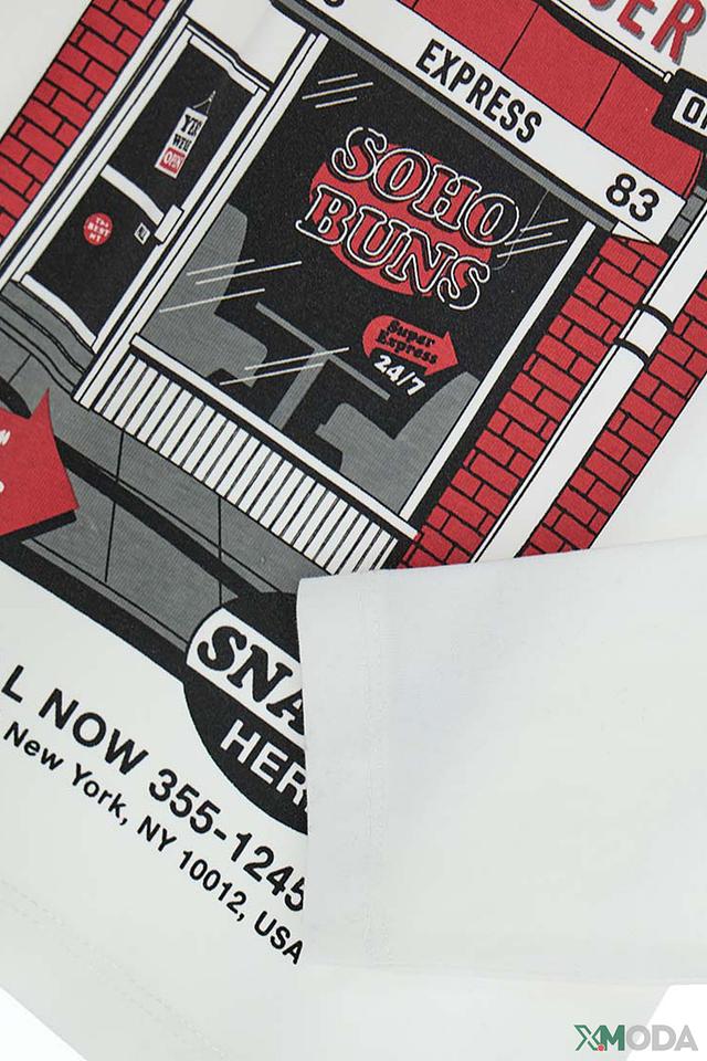 Эта стильная футболка от Original Marines выполнена в молочном цвете и украшена эффектным принтом с изображением бургерной "Soho Buns". Дизайн футболки привлекает внимание яркими деталями и оригинальным рисунком.