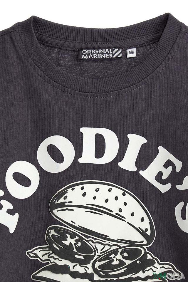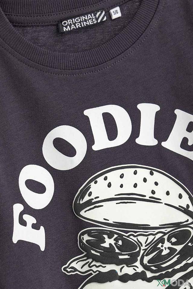 Основной цвет футболки – серый, который служит идеальным фоном для яркого и привлекательного принта. На передней части футболки расположен крупный, детализированный принт с изображением бургера и надписью "Foodie's Club".