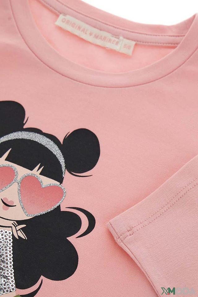 Розовая футболка Original Marines для девочки с ярким принтом и длинными рукавами. Изготовлена из мягкого хлопка с добавлением эластана для комфорта и свободы движений. Стильный и удобный вариант для повседневной носки. Состав: хлопок 92%, эластан 8%