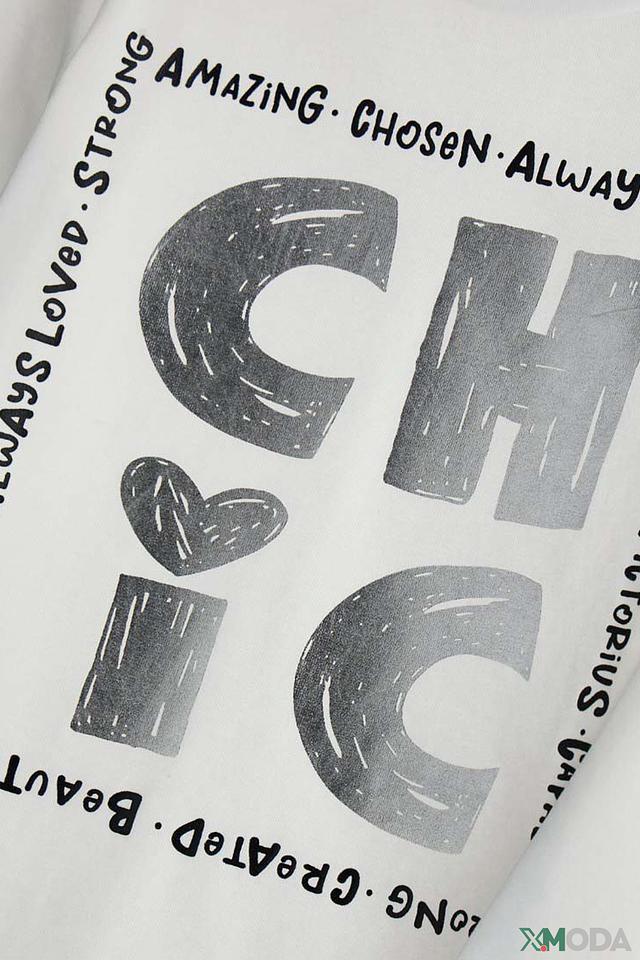 Особенностью данной модели является яркий и стильный принт "CHC" в сером цвете, который привлекает внимание и подчеркивает индивидуальность. Принт выполнен в виде крупных букв с текстурой, имитирующей потертости, что придает футболке современный вид.