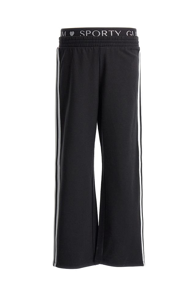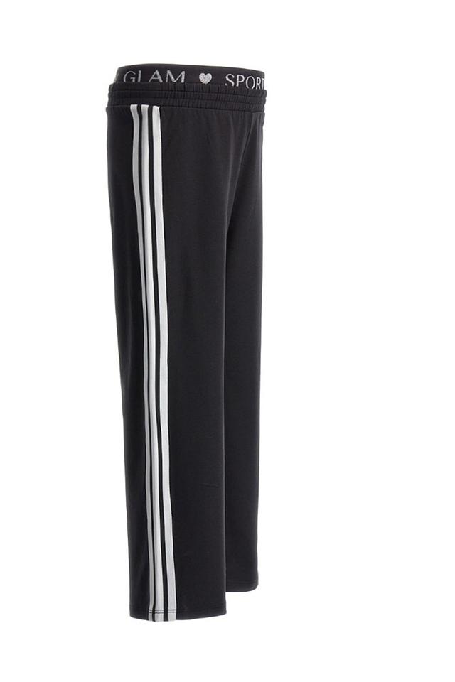 Брюки имеют классический крой с эластичным поясом, который не стесняет движений и обеспечивает надежную посадку. Боковые полосы белого цвета добавляют спортивный акцент и делают образ более динамичным.