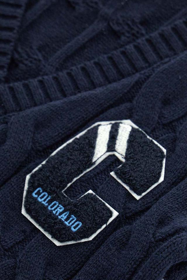 Модель имеет классический крой с V-образным вырезом и застёжкой на пуговицы. Рукава и нижняя часть кардигана выполнены рельефной вязкой “косы”, а на груди расположена декоративная нашивка с надписью “COLORADO”.