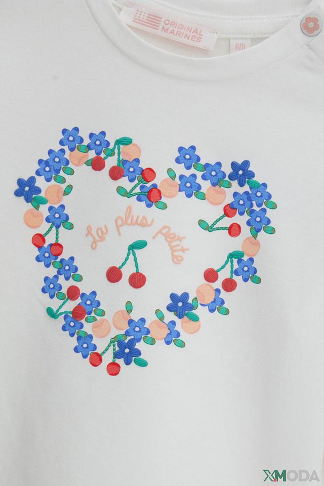 Детская футболка Original Marines молочного цвета с очаровательной вышивкой в виде сердца из цветов и вишен. Изготовлена из мягкого хлопка с добавлением эластана для комфорта и свободы движений. Состав: хлопок 92%, эластан 8%