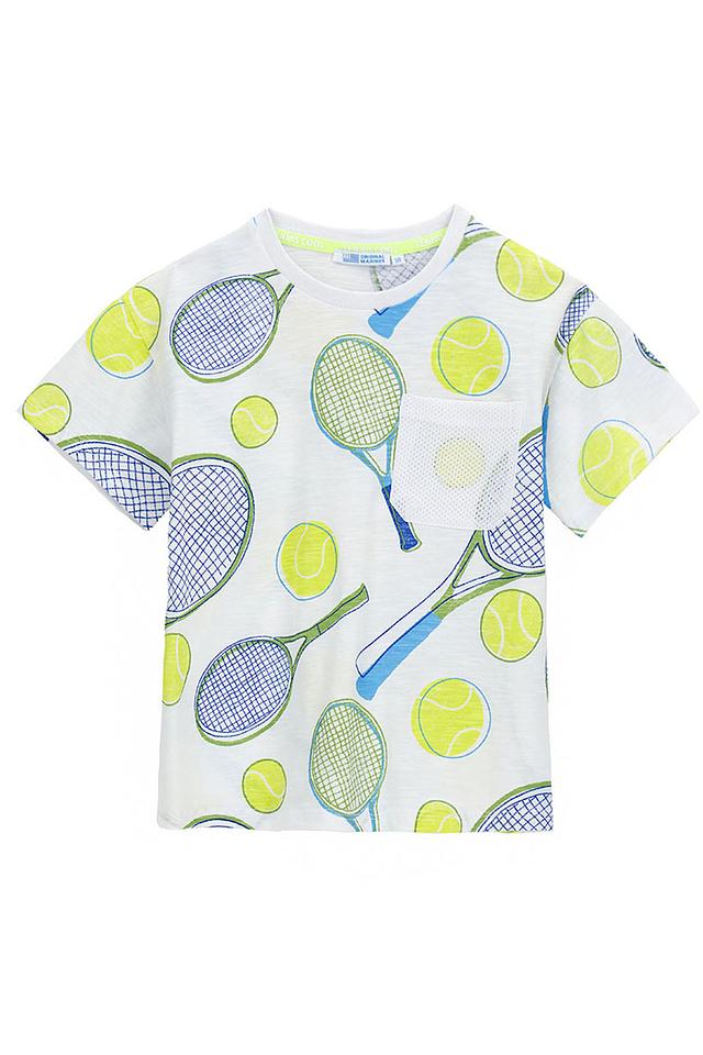 Футболка украшена забавным принтом в виде теннисных ракеток и мячей, выполненным в зелёных, голубых и жёлтых тонах. На груди расположен накладной карман из сетчатой ткани, добавляющий оригинальности образу.