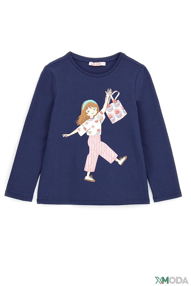 Основной цвет футболки – насыщенный синий, который прекрасно сочетается с ярким принтом на лицевой стороне. Принт изображает милую девочку с сумкой, выполненный в нежных пастельных тонах.